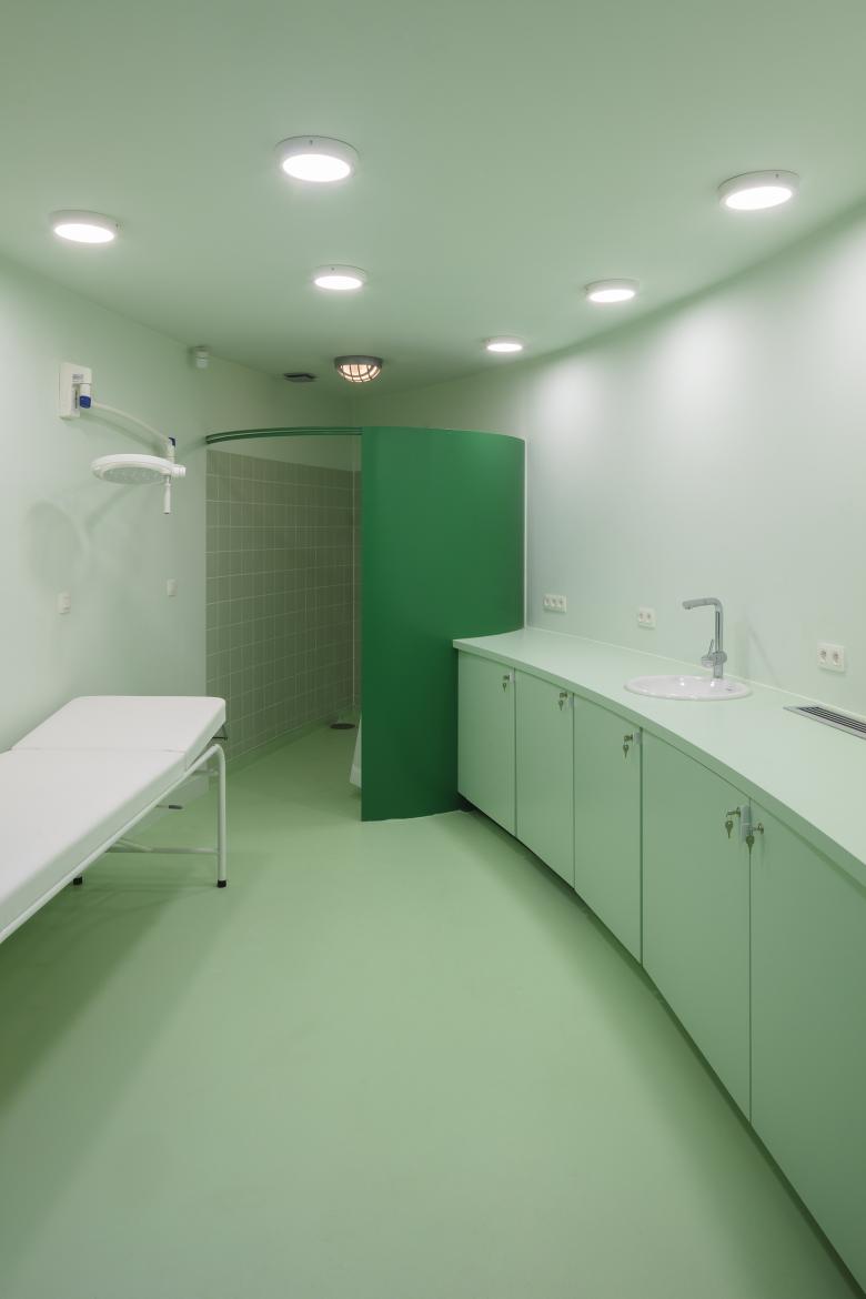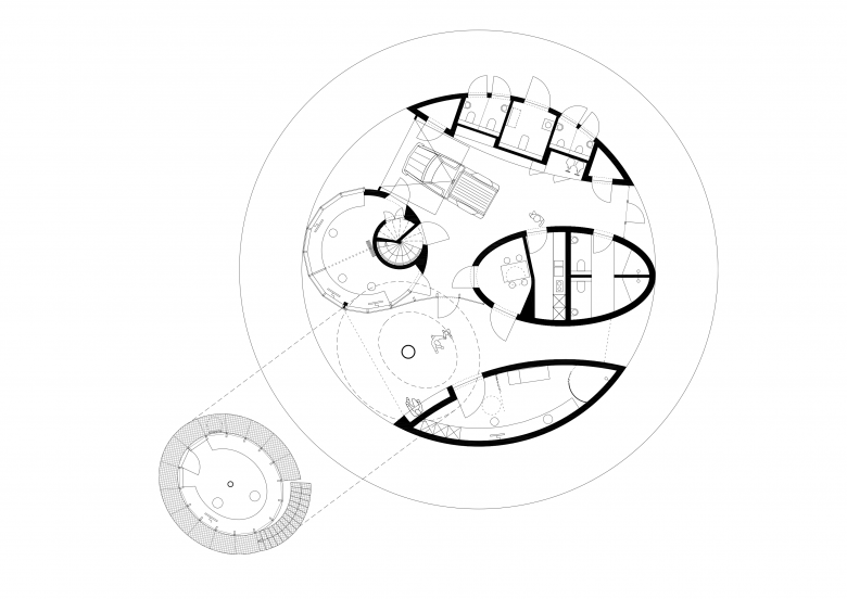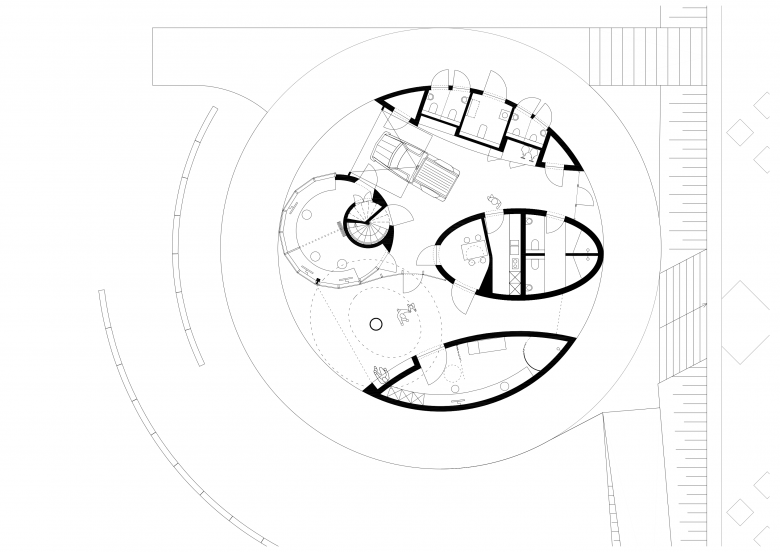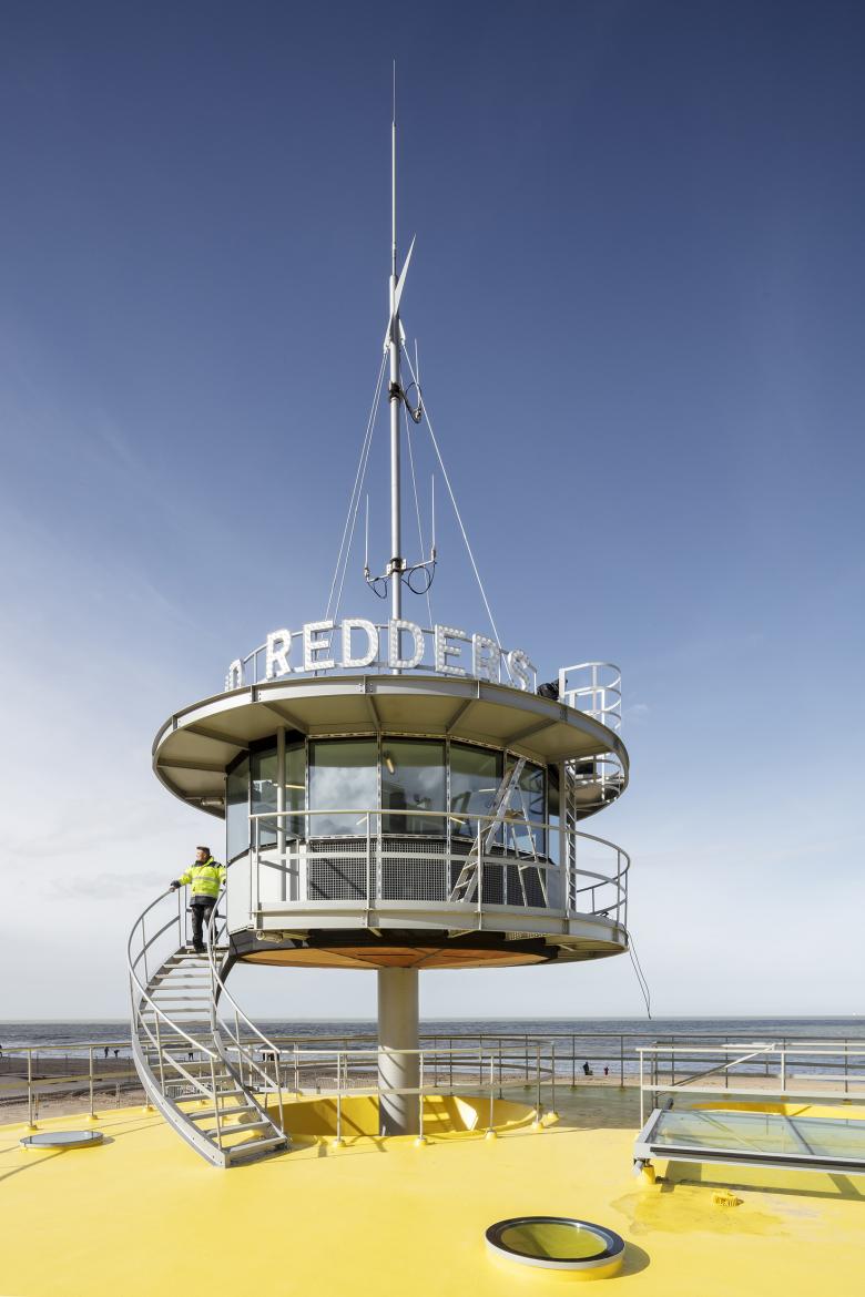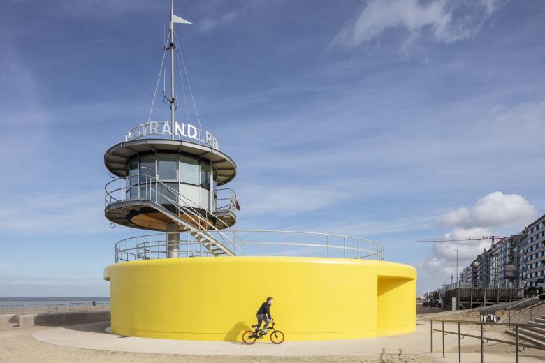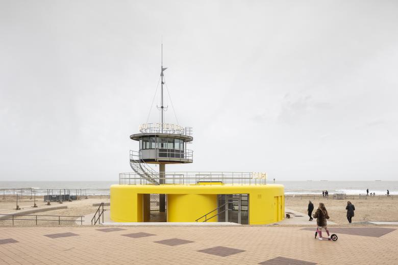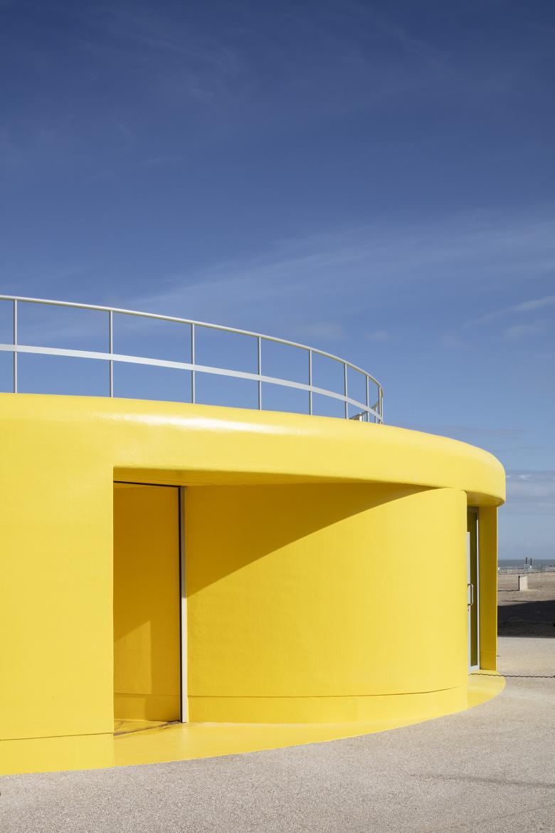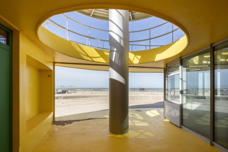This ‘machine à surveiller’ wants to be virtually absent, yet highly visible at the same time. From the boulevard, only the elevated look-out shows itself, as the cornice of the pavilion coincides with the horizon at sea. From the beach however, a cylindrical object lets in the most democratic of public spaces from all sides. It is bright yellow as plastic beach toys and buoys – as the sun, and one of the universal colours of the lifeguards. A sense of safety is induced by the pavilions’ taboo-free transparency and permeability.