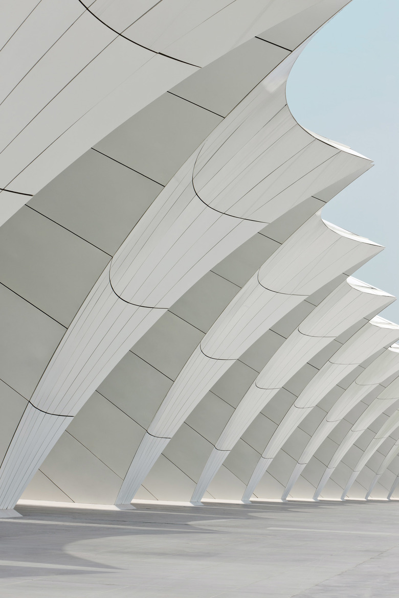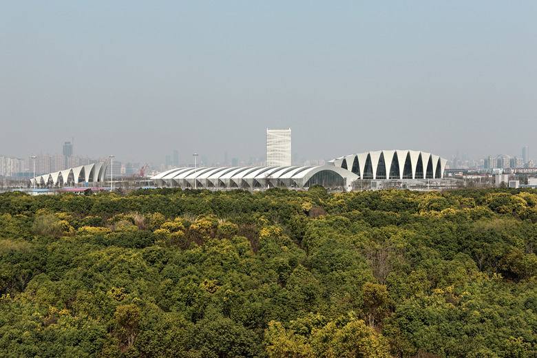 Shanghai was hosting the 14th FINA World Swimming Championships in 2011. This required the construction of a new 347,000m2 sports center comprising a new sports stadium, swimming stadium, an open-air pool for high-diving competitions, plus a media center. An artificial lake is the connecting element between the various stadiums. The buildings stand on raised platforms, which project into the lake. This produces a softly curving shore on the north side round the circular stadiums and a straight edge on the south side for the open-air pool.