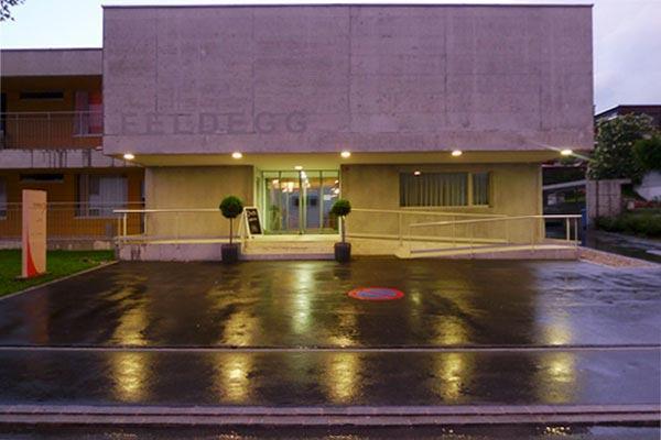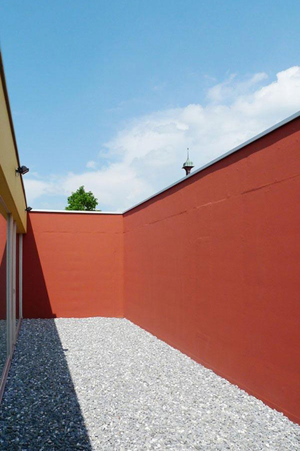 Die Baute liegt in einem ehemaligen Gemüsegarten. Die bestehende, schützende Gartenmauer, die bestehende Hecke und der Winkelbau bilden in unaufdringlicher Weise einen geschützten Rahmen für das hohe Alter.