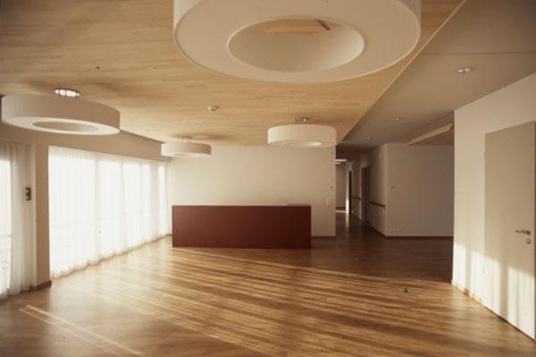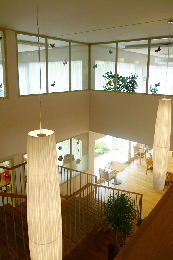 Jede Abteilung ist wie eine Wohnung mit gemeinsamen und privaten Räumen konzipiert. Der gemeinsame Raum wird durch die Nebenräume so strukturiert, dass die Zimmertüren an einprägsamen, kleinen Plätzen liegen. Solche Gruppierungen erleichtern die Orientierung.