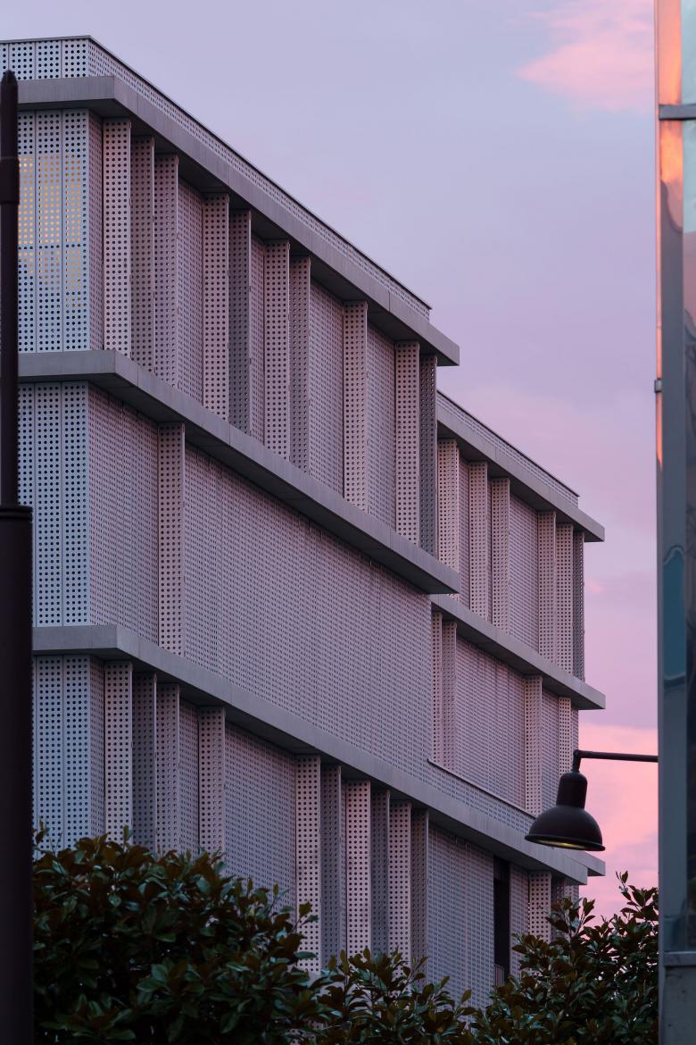 The project is conceived based on a facade module, a 30-centimeters-wide metal blade which declines itself into the cladding and accordion shutters. This element gives the building its industrial character and its perforation allows modulation of the views and natural light.