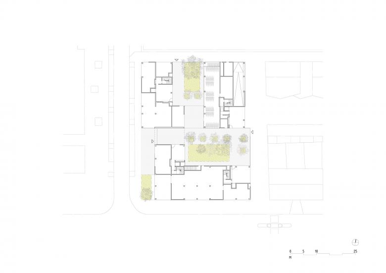 The project takes shape in the form of an articulated Y figure, composed by volumes ranging from 3 to 6 storeys, offering multiple orientations and views to the housing unit. It opens itself to the surrounding streets thanks to two landscaped courtyards linked by porches, thus creating a true open block permeable to pedestrians and bicycles during the day. The flats are accessible through four halls located in the heart of the block, offering a smooth transition from the urban space of the city to the private space of home ; the facades turned towards the streets are completely dedicated to commercial spaces.