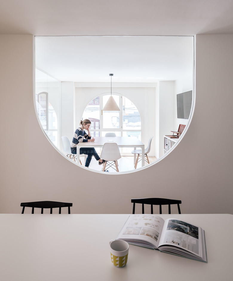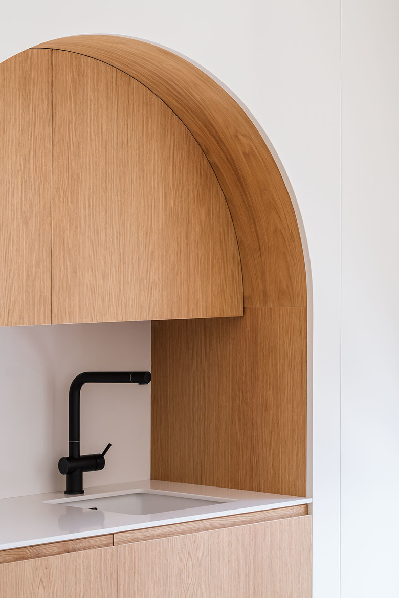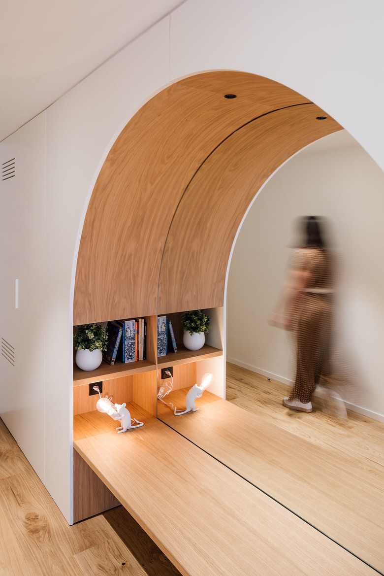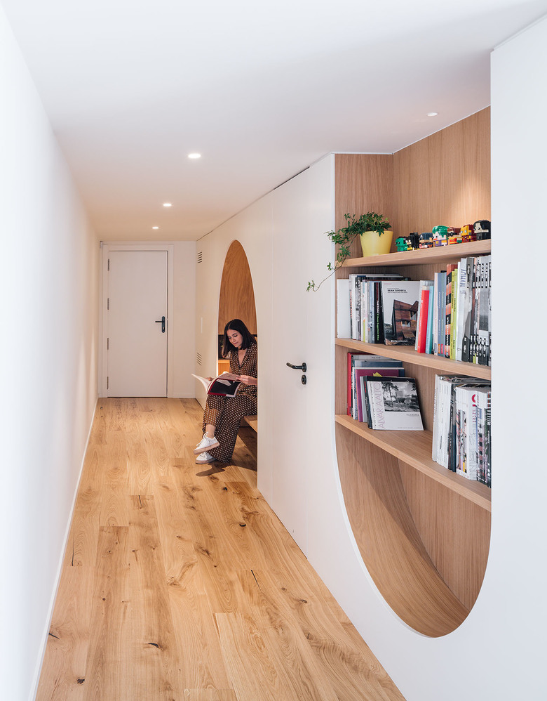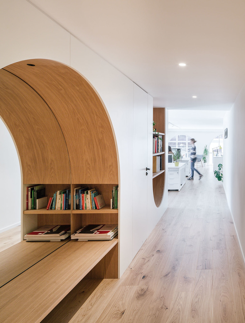 The natural oak material is present in the holes of the arches and the floor. This material turns paramount due to the absence of color of the rest of the furniture and furnishings, creating a pleasant feeling of harmony.