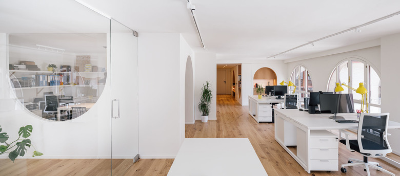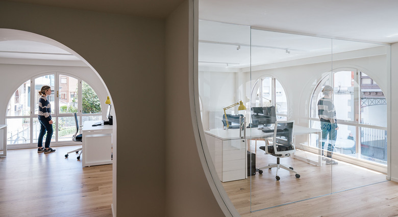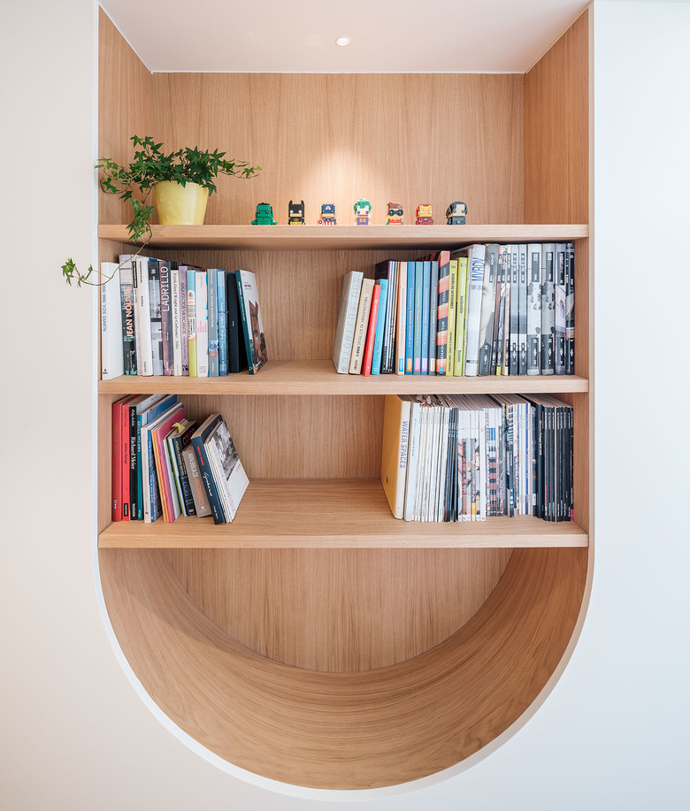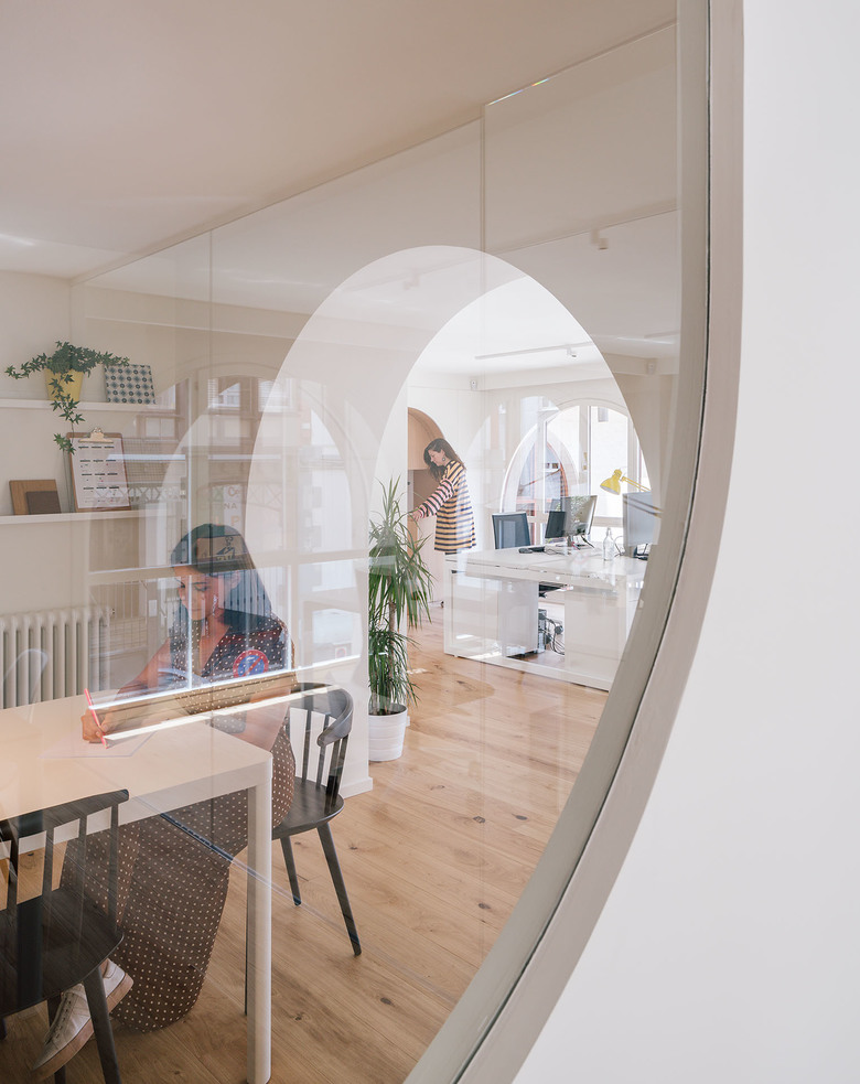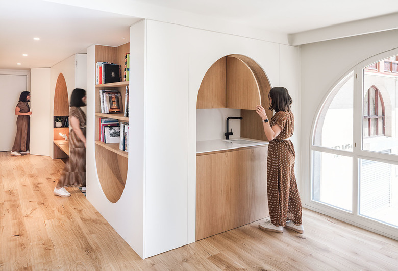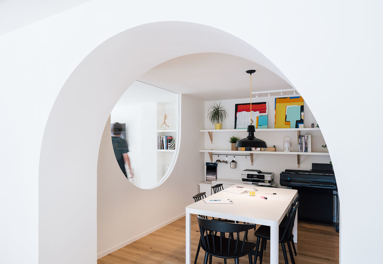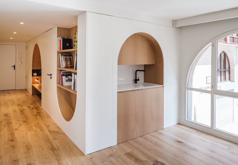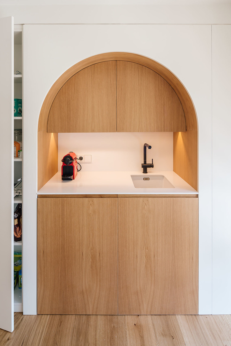 The natural oak material is present in the holes of the arches and the floor. This material turns paramount due to the absence of color of the rest of the furniture and furnishings, creating a pleasant feeling of harmony.