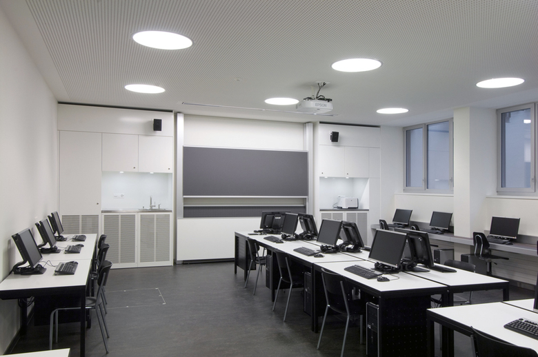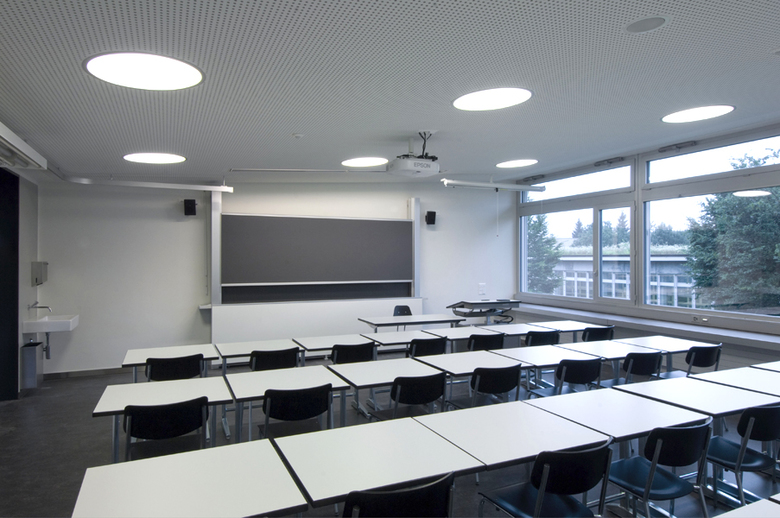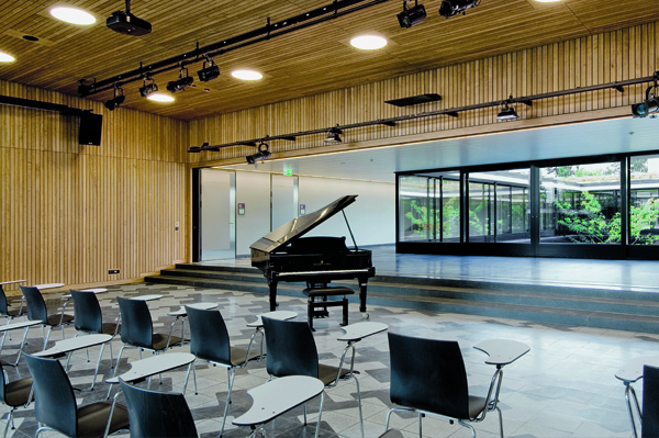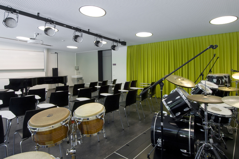 Das schulintern gesetzte aber nicht selbstverständliche Nebeneinander der Räume für Musik und der Räume für Geographie verlangten einen maximalen baulichen Schallschutz, deren Umsetzung sich am fertigen Bauwerk nur noch an den schweren Türen und den tiefen Leibungen erahnen lässt. Tatsächlich aber führten diese sehr hohen Schallschutzanforderungen zum teilweisen Fensterersatz, zu Doppelböden und Doppelwänden sowie verlangten generell nach einer sorgfältigen Ausführung der Details.