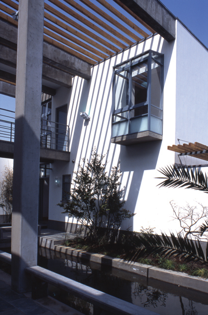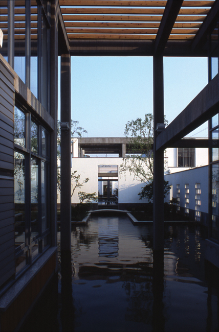 To avoid the complete isolation associated with traditional courtyards, we created a variety of openings on the walls to form visual channels. They allow users to have glimpses of the other courtyards and the park beyond, expanding their sense of space and linking them to the public life outside. The main channel, a north-south canal, penetrates all three parts of the Center. Additional channels of east-west direction are provided through slits on the walls. The front of the Park Administration facing the street has a double-layered façade, completing the hidden-and-reveal boundary.