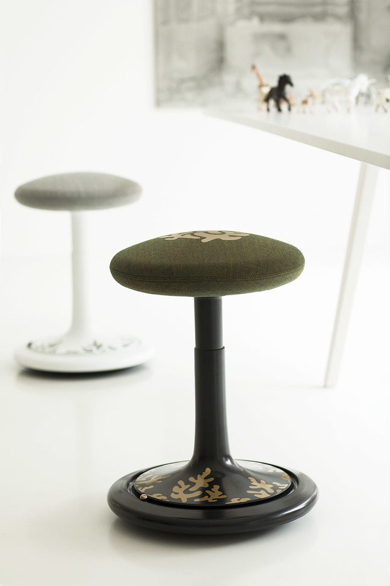 The Ongo Rhei Chair, the first of the special edition „designers’ collection“ is a contemporary production of an ergonomic design stool. It was developed in collaboration of reginadahmeningenhoven and Beate Steil and is the first of the special edition „designers’ collection“. Movement releases the energy of flow and stagnancy is interrupted by the Chair. Not only the product – the design of Ongo Rhei Chair is the visualization of movement, too. Everything flows. The unusual mix of textile and metallic printing is appealing with its simplicity in terms of colour.