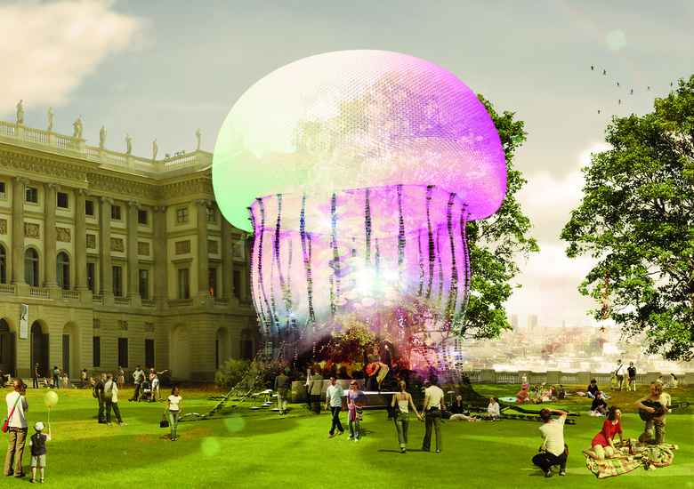 This imaginary jellyfish concept is designed by reginadahmeningenhoven for a pavillion at the furniture fair in Mailand, where the newly developed ongo-stool is presented. The goal was to create an exhibition that involves sense experience by entering the different entertainment zones, the meeting point, bar and test area for new products. The moonscape design beams the visitor in a new space, isolating him from everyday’s life. This magical scenery elevates it’s visitors in a rare wonderful dream.