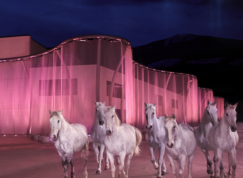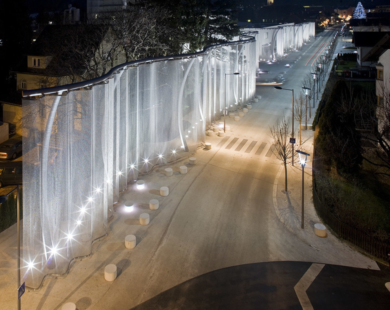 This sophisticated and fantastic veil has been completed in 2008 for the Swarovski works in Wattens, Austria. The Veil transforms the Swarovskistraße in a bright boulevard of constant magical change. The new pathway marked by the billowing veiled curtain becomes a new place of poetic play; of light and shade; of an iridescent dalliance of colors and of amazingly magical moments of expression and transformation. During the day, rays of sun and passing clouds toy with the new space, creating a continual metamorphosis. Depending on how the sunlight meets the curtain and on the visual angle, the curtain emerges either as a dazzling, sparkling veil or vanishes completely from the eye. The incessant transformation of the curtain at daytime triggered by the sun and the clouds is emulated at nightfall by luminaria. A peaceful start, as if by magic, triggers an interaction of color with the hues of the sky. The intensity of the light adapts to the surrounding brightness; not glaring or vying for effects, but of a harmonizing and soothing quality. The lighting dims. We gently draw the curtain. The silent movie starts and follows a virtual script composed of an overture, calming shades, quick and quiet rhythms. The veiled curtain forms the groundwork of the installation. The soft change of color and lighting makes the curtain radiate like a crystal, with an opulence of hues ranging from mythical blue to a clear, bright white. Like all other design elements, the light conveys an activating seeing. Like creatures of the light and natural phenomena, the statures rejoice in merry games. The veil is made of a corrosion- and weather-resistant stainless steel mesh. It gives rise to a varied play of light and embodies a never-before seen materialness, held in place by a 10-meter high steel stringer. A group of illuminated pads creates a seating arrangement and doubles as the boundary to what lies beyond… During the day, rays of sun and traveling clouds revel in this space, triggering a constant change. When night falls, a spectacle takes place that lives in harmony with the hues of the sky. This setting forms the groundwork for a permanent and enchanting transformation.