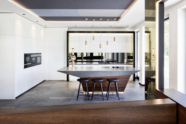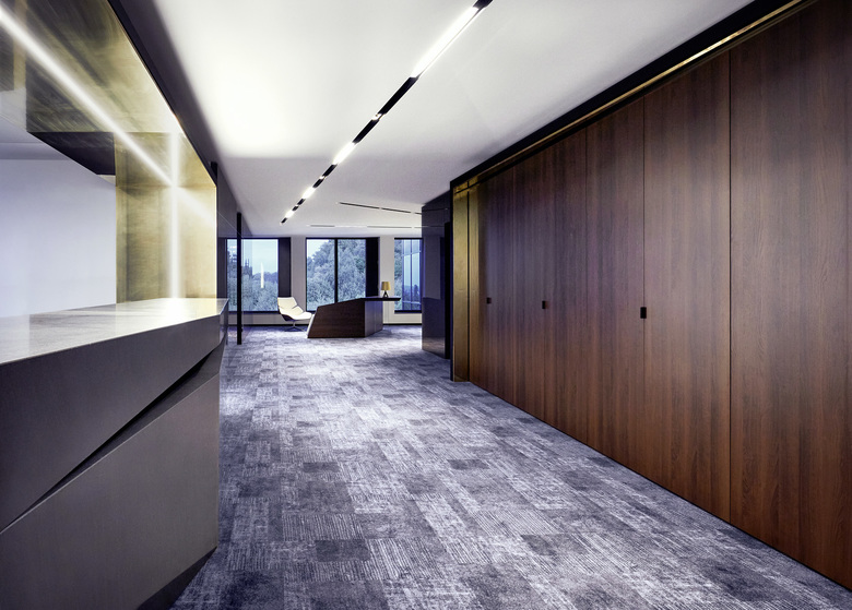 Die Atmosphäre der Büroräume ist zugleich klar, reduziert und anregend. Sichtschutzgrafiken an den Glaswänden trennen die einzelnen Bereiche und Büros voneinander ab und schaffen zugleich Verbindungen und Transparenz. Dieses offene Design des Interiors findet sich auch in anderen Bereichen des Gebäudes wieder und wird vor allem durch den Einsatz von Spiegeln und Glas verstärkt. Die daraus entstehenden Reflektionen schaffen ein aufregendes Spannungsfeld zwischen Einblicken und Ausblicken. Während die großen Fensterfronten und die offene Raumarchitektur den Blick nach draußen lenken, übertragen Verspiegelungen die Natur ins Innere. Das Gebäude scheint sich nahezu übergangslos mit der Natur zu verbinden. Sie wird zum Hauptakteur, während die architektonische Gestaltung in den Hintergrund tritt und lediglich einen Rahmen bildet. Der Mensch und die Natur erfüllen das Gebäude mit Leben und Wärme. Rahmen sind ein zentrales Designmotiv, das sich immer wieder findet. So sind Teeküche, Rezeption und Mitarbeiterküche mit verschiedenen Materialien wie Glas, Spiegel oder Messingverkleidungen eingerahmt. Das Designelement des Rahmens dient als eine Art Passepartout, es lenkt den Blick auf das Geschehen in den einzelnen Bereichen. Der Designgedanke der Naturverbundenheit drückt sich auch in der Verwendung von wertigen Naturmaterialien aus. So vermittelt gewalztes Messingblech sowohl Ursprünglichkeit als auch Erfolg und Wohlstand. Im Laufe der Zeit oxidiert das Metall und verändert seine Beschaffenheit, sein Goldton steht gleichzeitig für Wertigkeit. Amerikanisches Nussbaumholz gibt ein Gefühl von Wärme und Geborgenheut und bildet damit einen spannenden Kontrast zu den Materialien Glas und Metall.