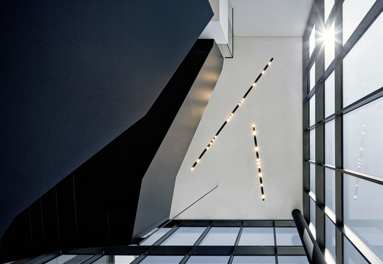 Dynamik, Offenheit und Naturverbundenheit sind die zentralen Bausteine des Designkonzepts. Das Thema Dynamik zieht sich wie ein roter Faden durch alle Räume des Gebäudes. Besonderes Augenmerk liegt in diesem Zusammenhang auf der opulenten Stahltreppe im Atrium. Die Treppenskulptur gleicht einem aufsteigenden Pfeil, inspiriert durch die Kurspfeile an der Börse, und symbolisiert Energie und aufstrebende Visionen. Asymmetrische Designelemente bei der Boden- und Wandgestaltung erwecken ein Gefühl von Dynamik. Dieser Gedanke spiegelt sich auch in den polygonal entworfenen Möbelstücken und im Lichtkonzept wider. Die Lichtstreifen in der Decke sind den Laufwegen der Mitarbeiter angepasst und liegen asymmetrisch zur Verlegung des Bodens. Dies lädt die Wege mit einer dynamischen Energie auf.