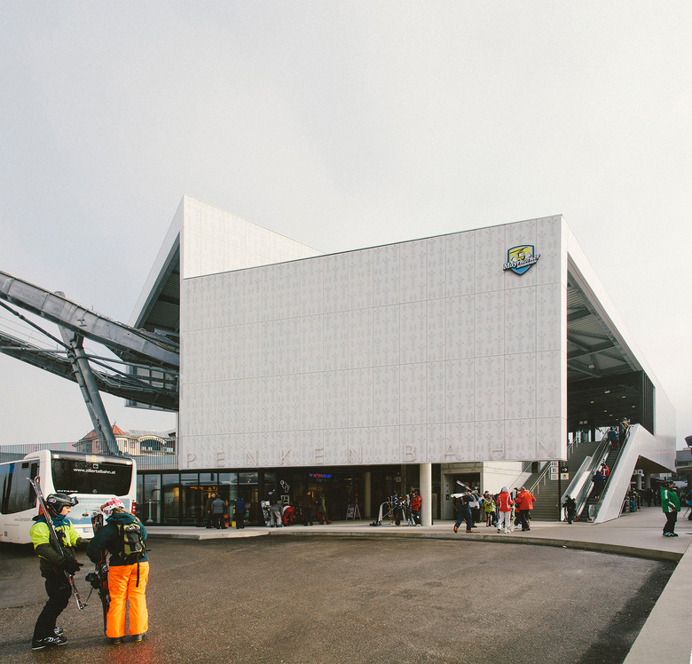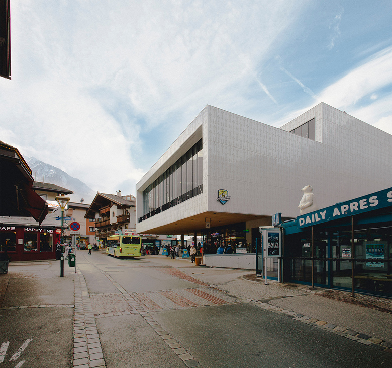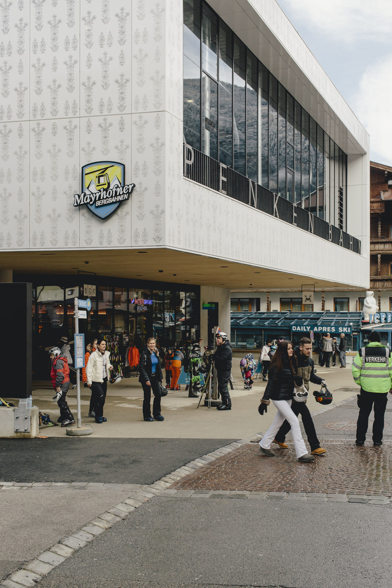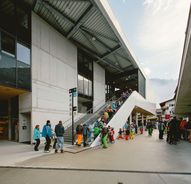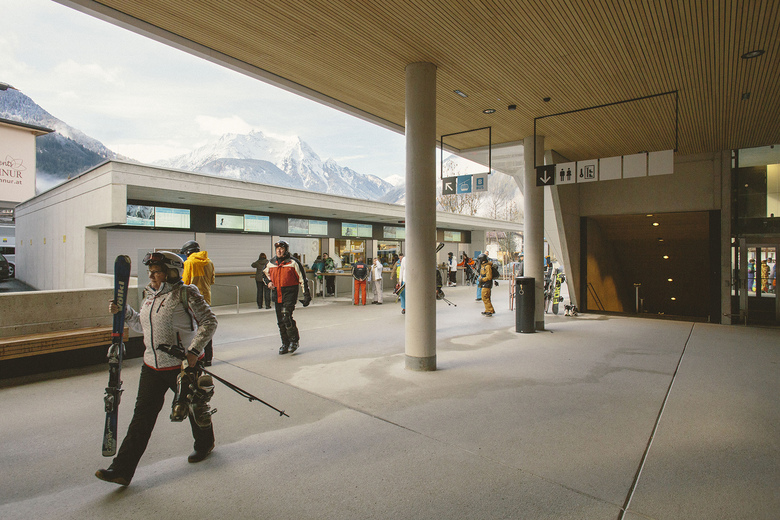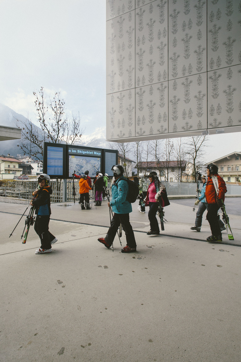 Erfreulich ist das quirlige Leben, das die Talstation im öffentlichen Raum wie von selbst bewirkt. Kein öder Parkplatz, der üblicherweise wie das Fegefeuer vor dem Skiparadies liegt. Wir finden uns mitten im Wintersportort. Allerdings auch eine Beengung von allen Seiten. Das Programm ist ein sehr großes, kaum beherrschbares Volumen, und weitgehend festgelegte Funktionsabläufe.