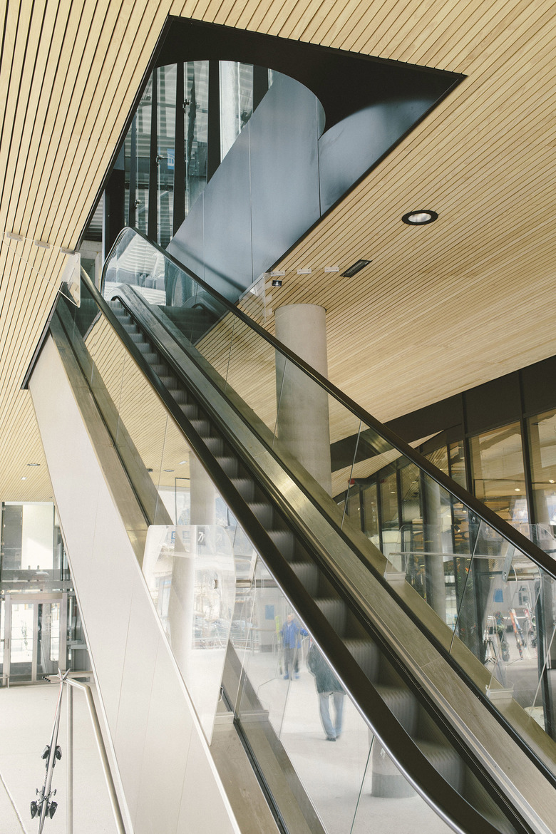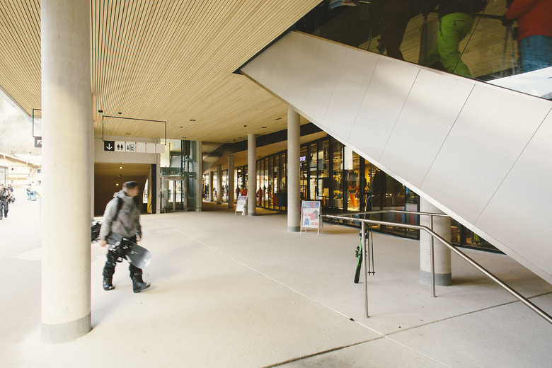 Die stützenfreie Auskragung überdeckt einen Raum von ca. 300 m2, der beidseitig von langen Holz-Sitzbänken gerahmt ist. Die besonderen Oberflächen (Brettstapeldecke, Holz-Glas Fassade zum Sportgeschäft) signalisieren, dass hier mehr als Warten geschehen kann: Musik, Lesung, Kleintheater, Skateboardcontest, Tanz oder schlicht und einfach Fest und Party.