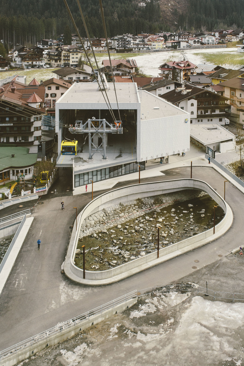 Die Kassen, separat mit großem Vordach im Süden am Ziller, sind durch eine durchgehende, abgetreppte Sitzbank mit der Dorfstraße verbunden. Da nordseitig die Absenkung für die Garageneinfahrt des Hotels zwingend ist, ergibt sich auch die Anlieferung von der neuen Zillerbrücke an diese Stelle logisch. Verkehrstechnisch ist anzustreben, dass die dorfseitige Tiefgaragenrampe mittels flexibler Poller aufgelassen wird (Notzufahrt), die Hotel-Anfahrt ausschliesslich vom Ziller her erfolgt und der neue Dorfplatz bis zum Hotel sich erweitern kann.