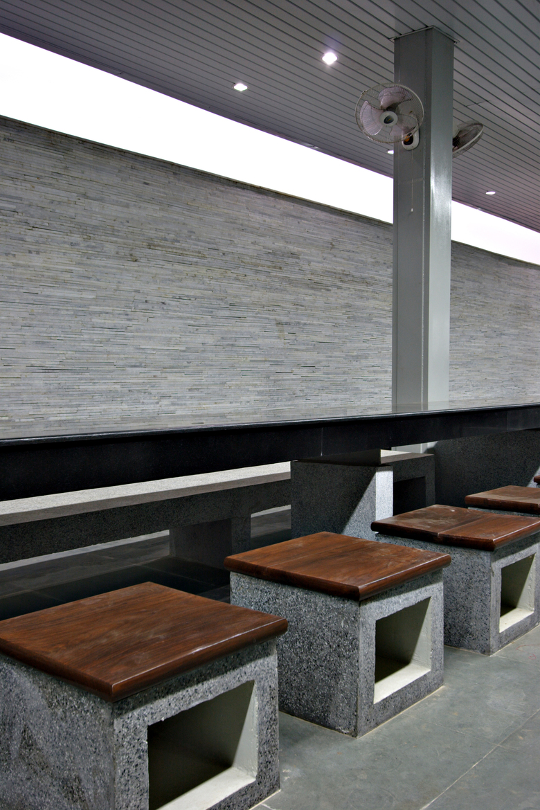 The building block has a kitchen block to the east, which is a fully enclosed space to cook and serve in. As One walks along the length of the building westwards, initially the eating enclosure is defined by two walls and a roof, further still the sense of interior is defined by one wall and the roof, further still the space is articulated by only one wall, and yet further still, there is only the floor, and then that too stops continuing.