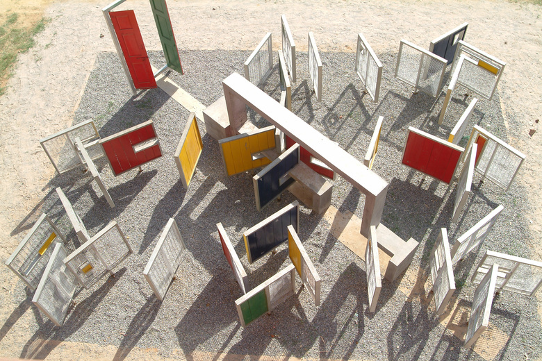 We approached the creation of the playground a story where the children could redefine the storyline through the kinetic dynamics of the playground each time they engaged with it. A playground that was as dynamic as the games that unfolded on it. The playground was seen as the canvas on which a child could unlock new worlds – different from the fixed spaces determined by adults in her day-to-day life. Although the playground we created is potentially ever changing in its structure – there is a formal structure to the space within which the moving parts define possibilities. It is placed on a regular grid of pivoting panels, set on a squared gravid pit with a diagonal undulating concrete path running through it. The path starts on the ground, then elevate into space before coming down again.