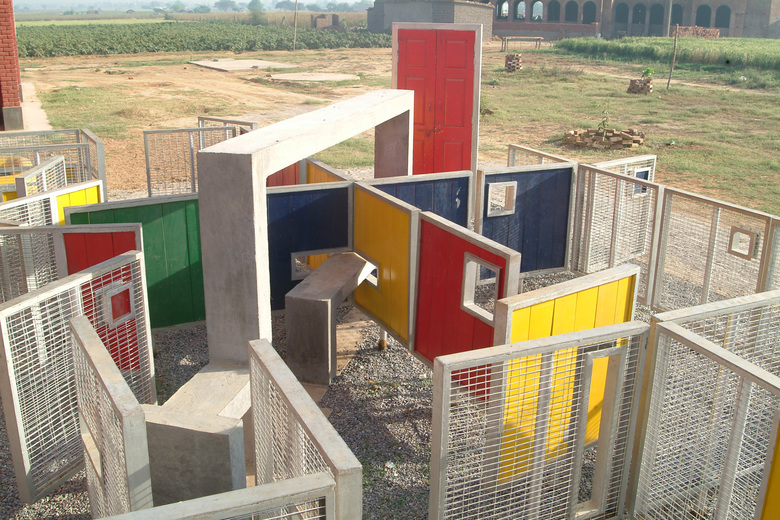This playground is – for the children as much as for the design team – an act of irreverence towards all that architects deal with in our everyday life. The concrete band running diagonally through the playground is simultaneously a path and a diagrammatic sliver of a home which starts at the green door with a front courtyard (a public space) transforms into a bench and then as it moves towards the center of the playground, it hints towards an identity that could be wall, a roof, a bed (a more private space) and so it moves onto the rear courtyard (a semi-public space).