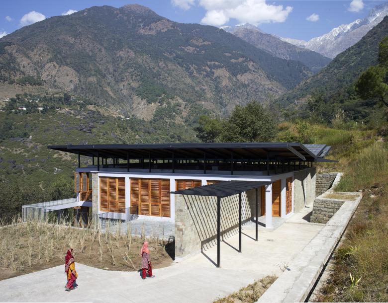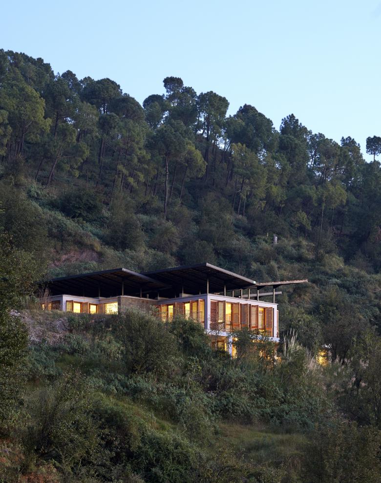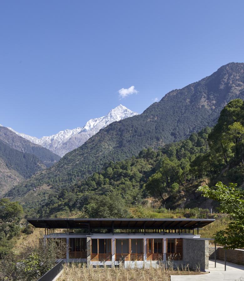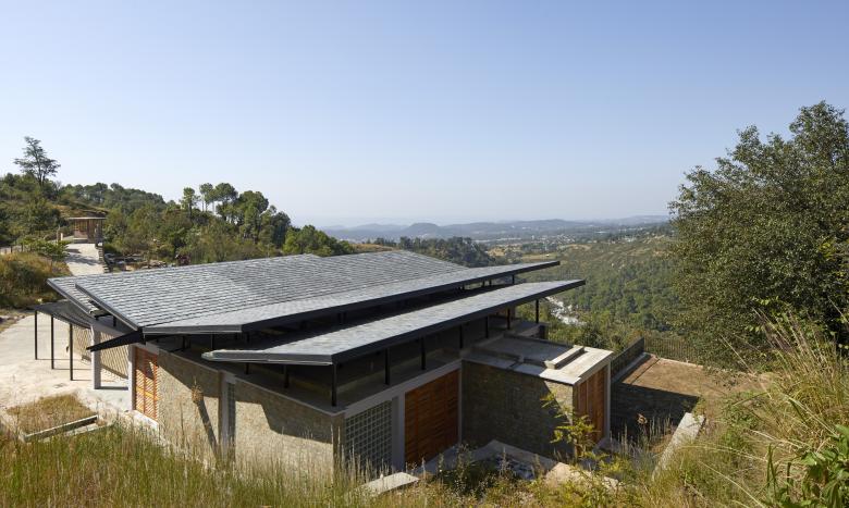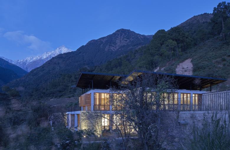 The flying house is a four-bedroom family villa situated on the rising hills at the foot of the mighty Dhauladhar range of the Himalayas. The flying house, so-called because of its prominent inverted roof form is situated on the low hill and opens onto the expanse of the low valley of Kangra as well as the snowcapped peaks of the Dhauladhar range.