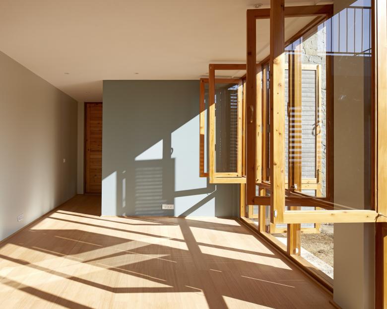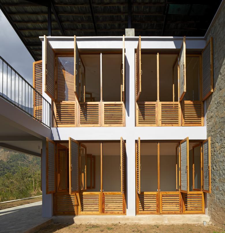 Constructed with local material sourced from within 10 kilometers of the site, the architecture of the building references a contemporary interpretation of traditional construction methods. The inner walls of the building are constructed from stabilized mud bricks and the outer frame is constructed from precisely cut interlocking local stone. The house is entered at the upper level where the living dining and kitchen are located as well as two bedrooms. The lower floor of the building is created by excavating the earth from the sloping hillside and houses two additional bedrooms. The orientation of the house is such that all the rooms open towards the valley.
