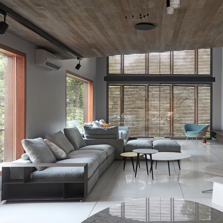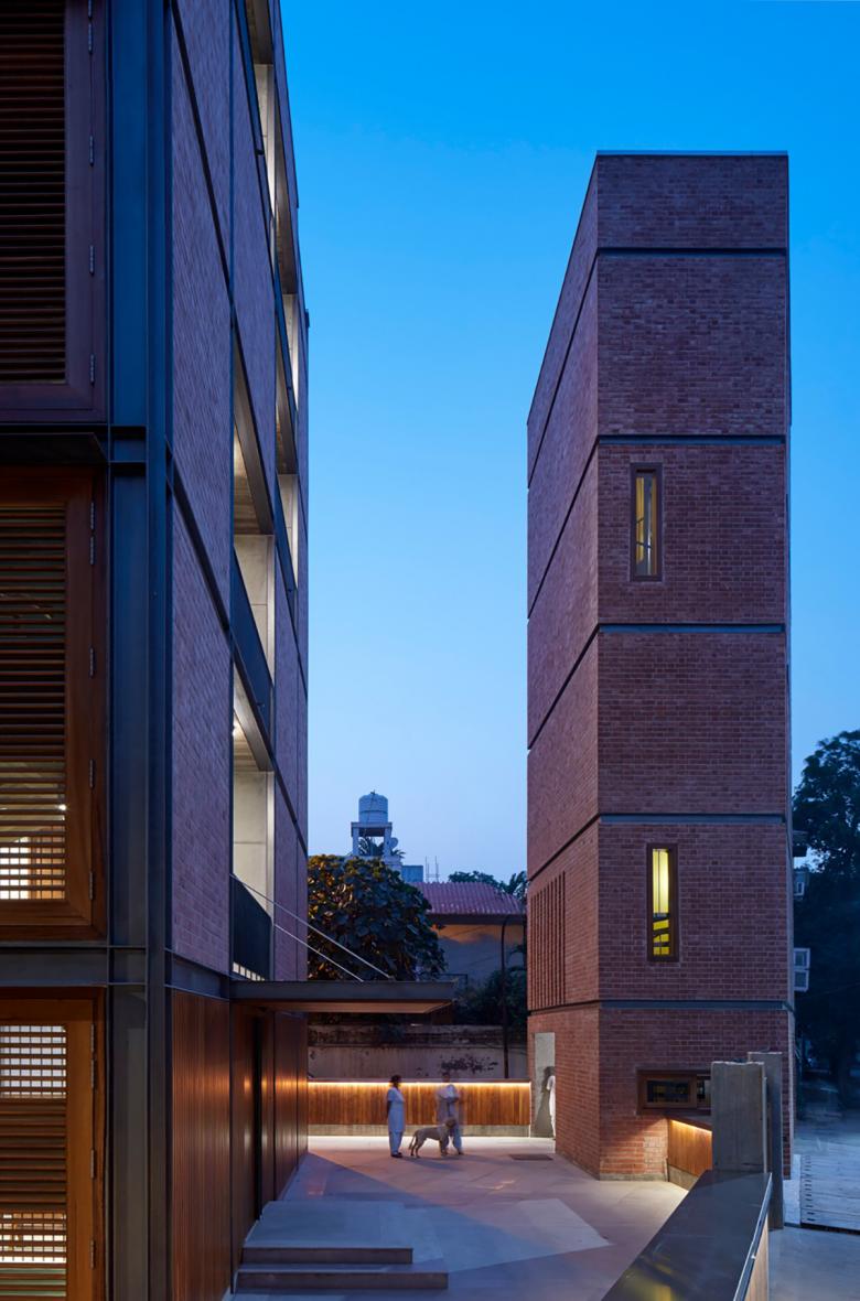 The Tower House is a multi-generational home on a peculiar wedge-shaped site, on the end of a row of semi-detached buildings in New Delhi. The building is conceived as three distinct masses that respond to the site’s geometry and the family’s needs. In a city where the urban texture is increasingly defined by plaster buildings clad with laminates and textured paints, the tower house attempts to bring back an architectural language that appears to be slipping away from our urbanscape. Internally also, countering the tendencies towards false ceilings and decorated surfaces, the building celebrates the exposed concrete ceiling, cast in situ floors and exposed brick walls. The narrow front portion of the house comprises of 2 living spaces, both double height which sectionally connect the four floors of the house. Materially the front block is constructed out of stone and wooden louvers with the fenestrations informed by the sight lines defined from within the building. The second block is the private living space for the family. Sectionally simpler, this block is constructed in brick and steel and set within a very rigid geometric grid of open and closed zones. In an increasingly digital age, the house aimed to disrupt trends of cellular living by designing common spaces that allow for autonomous and collective living at once. The double height family spaces force social contact in perhaps a banal but vital day to day manner. The third block is a service tower which houses staff living spaces, generators, water pumps and other services. This tower is a reconstructed remnant of the previous building that stood on the site and a reminder of the site geometry.