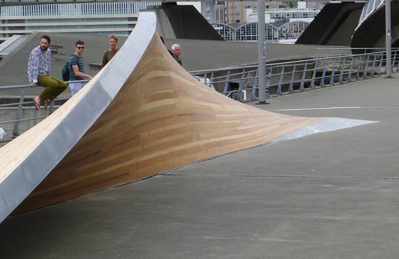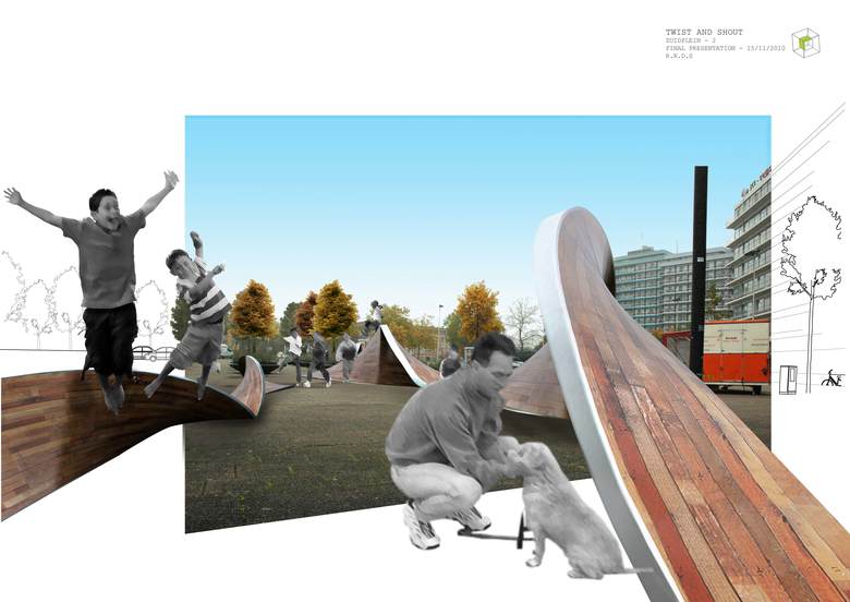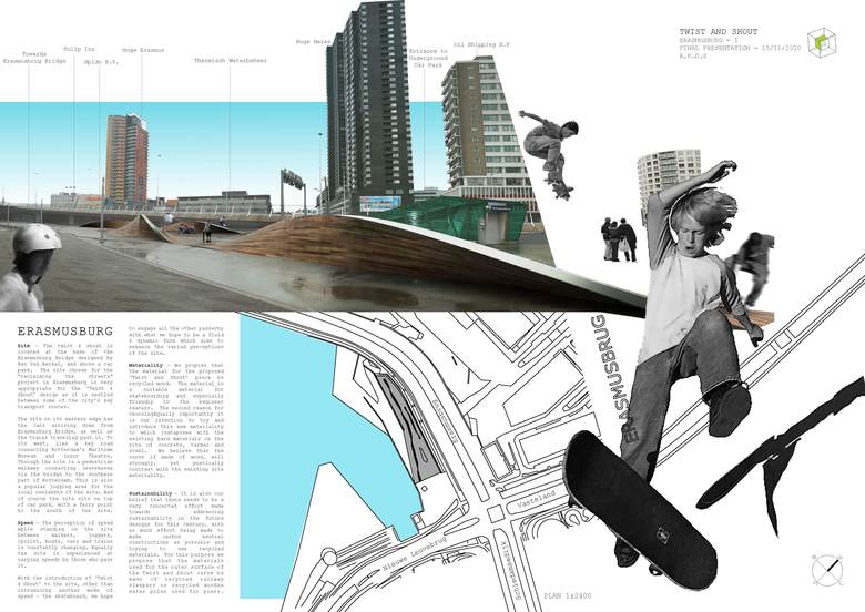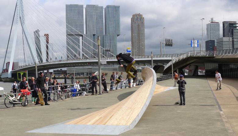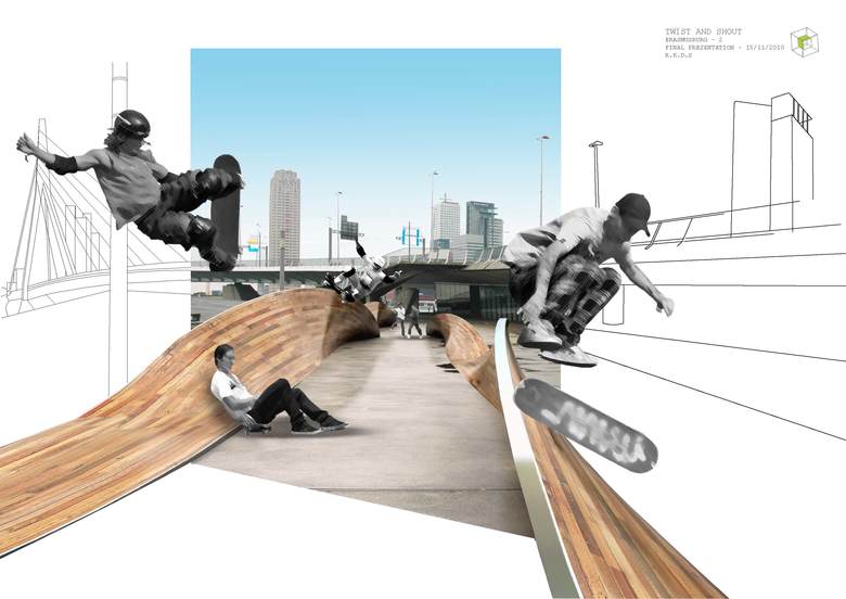 The structure is imagined as a metal framework on which wooden pieces are fastened, allowing it to be a light and easily transportable object. Therefore the structure can be “plugged in” anywhere in the city so skateboarders and pedestrians can enjoy a wide range of landscapes while skating and walking through Rotterdam.
