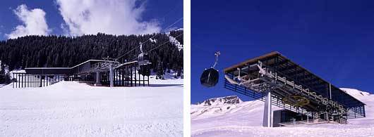 Zum Beispiel bei der neuen Talstation in Flims: Die prägnante und multifunktional nutzbare Gondelhalle mit Ausfahrt ruht auf einen Sichtbeton-Sockelgeschoss, das die betriebstechnischen Räume (Eingang, Kassen Büros etc.) aufnimmt. Die Zweigelenkrahmen aus Furnierschichtholz, die von horizontal gegliederten, schuppenartig vorgeblendeten Holz- resp. Glasplatten umschlossen werden, dienen als Haupttragwerk der Gondelhalle. Die Schuppung findet in der Dachebene in ausgeprägter Form ihre Fortsetzung und ermöglicht eine natürliche Belichtung.