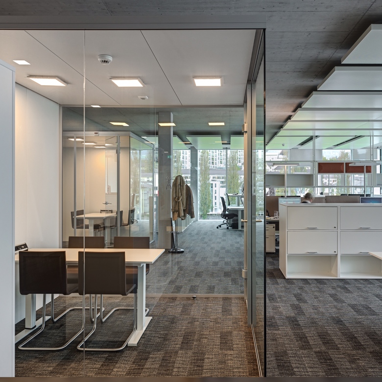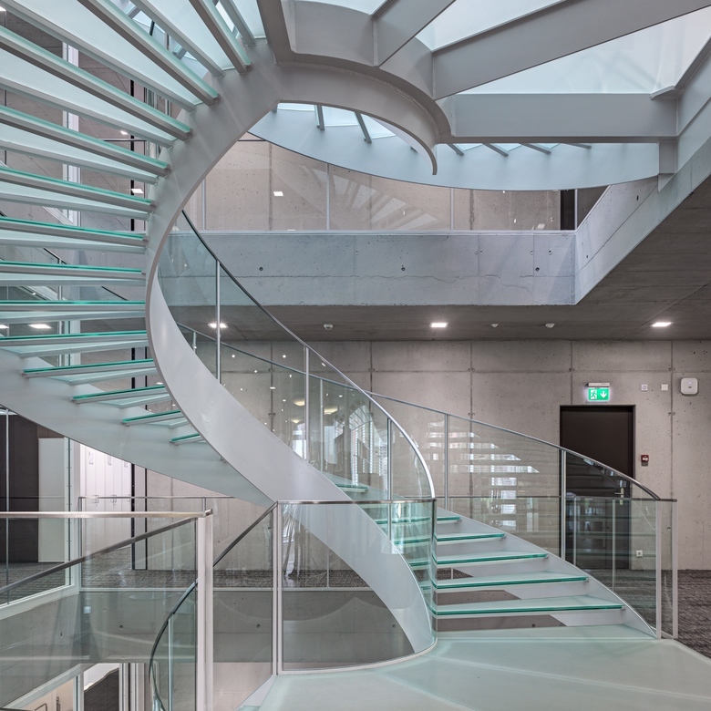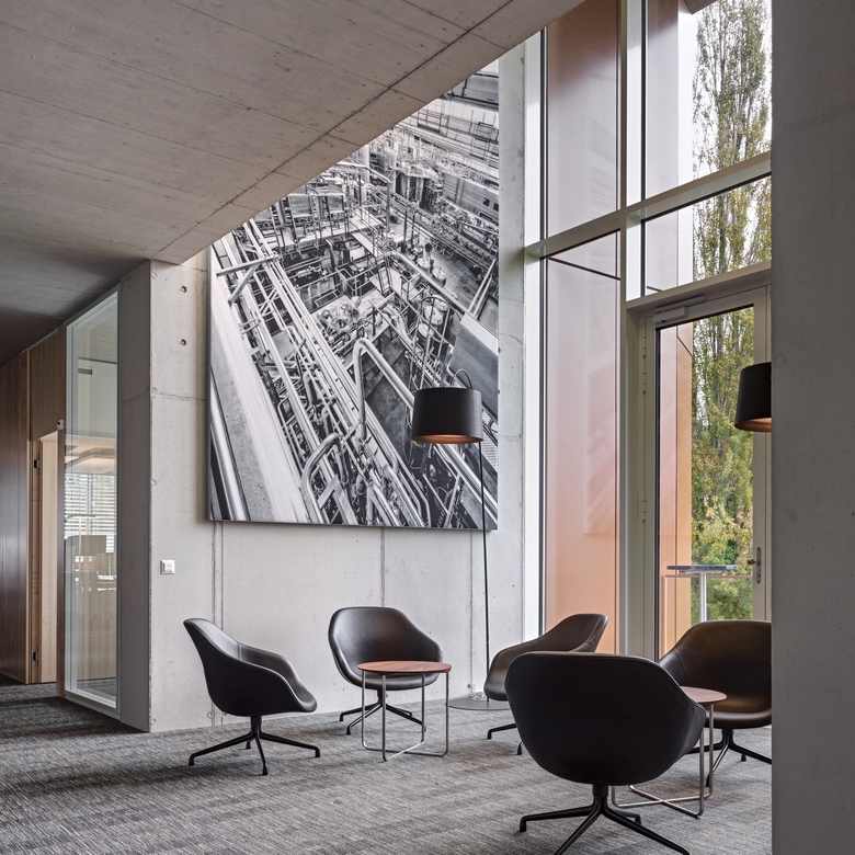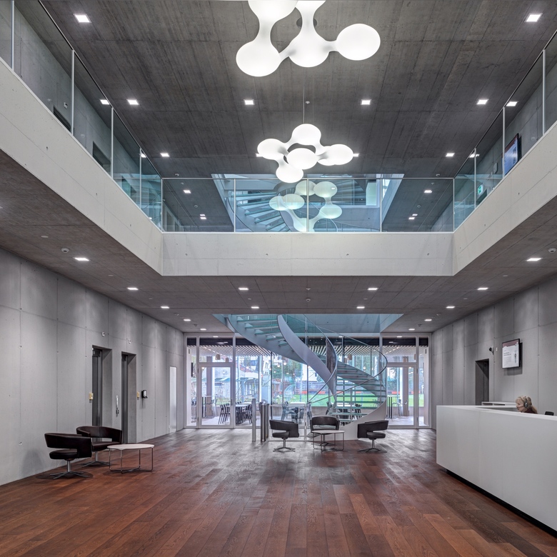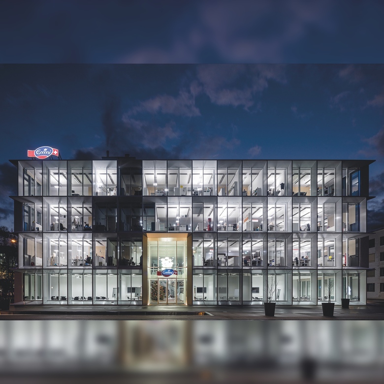 Der neue Konzernhauptsitz von Emmi mit 200 Arbeitsplätzen präsentiert sich als Solitärbau mit vorgelagerter Piazza. Das äussere Erscheinungsbild ist von der einer Rasterfassade bestimmt. Der in der Grundfläche quadratische Baukörper mit seinen vier Geschossen, wirkt zusammen mit den spiralförmig angelegten zweigeschossigen Kommunikationsräumen sehr offen und lichtdurchflutet.