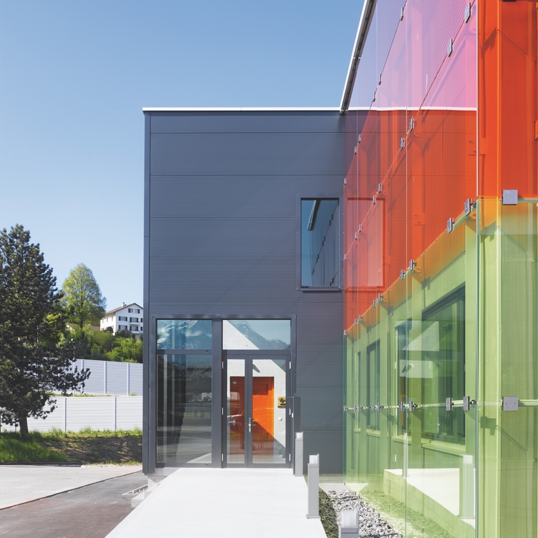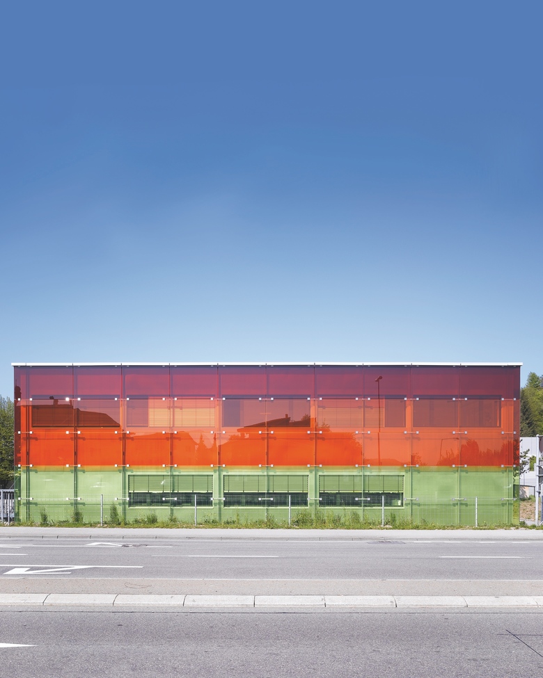 Das Gebäude hat neu eine Doppelhautfassade aus Verbundsicherheitsglas mit gelb, orange und rot eingefärbten Folien im Zwischenraum. Die vor allem im Sonnenlicht stark leuchtenden Farben lassen die Vehrkehrsmanagementzentrale wie eine Verkehrsampel in der sonst eher grauen Gegend entlang der Autobahn aufleuchten.