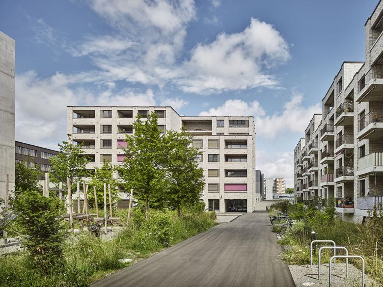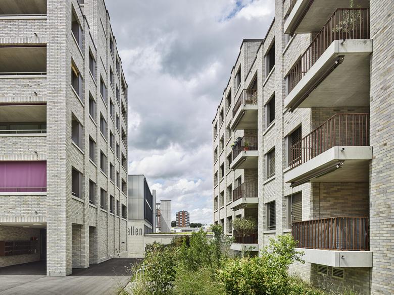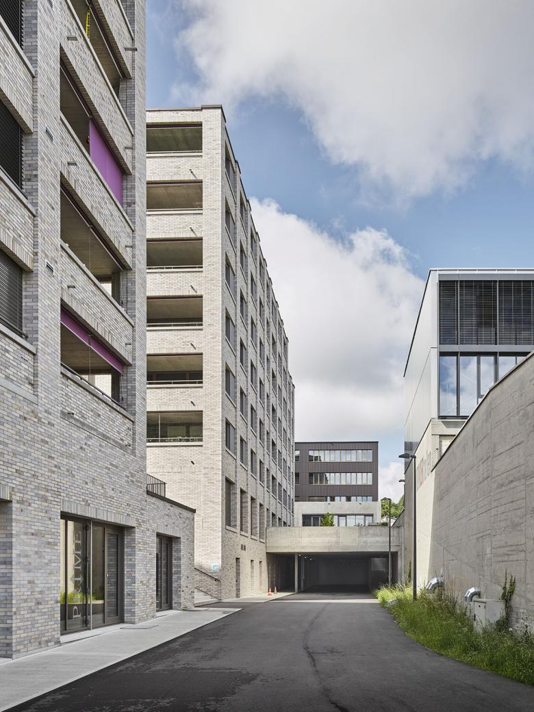 Das zurückhaltende Fassadenbild lebt von der Plastizität der Klinkeroberfläche und dem feinen Spiel der Farben. Es wurden hellgraue Klinker mit warmen Farbnuancen ausgewählt, die sich harmonisch in das Umfeld einpassen. Helle Fugen, Fensterbänke in Beton und Fensterfüllungen in Wellblech runden das Bild ab. Die Gebäude entsprechen dem Minergie Standard.