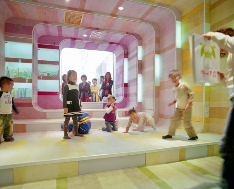 KID’S REPUBLIC in Beijing has an activity room on the first floor and a children’s bookstore on the second floor. The activity room on the first floor is a rainbow-like space created with 12 colorful ribbons of different perimeters. Activities like story-telling and animation shows are periodically held here. The section gaps in the wall and ceiling are used for illumination or displaying items, while those in the floor are also used as a stage and an auditorium. Carpets are laid in the room for children to freely sit and lie down on the floor.