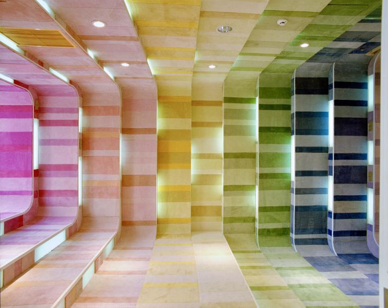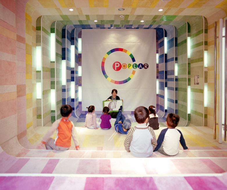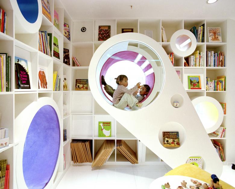 The stairs leads the children to the bookstore on the second floor. The rainbow-like ribbon starts from the hall and goes up along the stairs till the bookstore. The 100-meter-long colorful ribbon, which serves various functions at various places, whirls and twists in the store; it finally ends in the room and goes back to the armrest of the staircase baluster on the first floor where it had started.