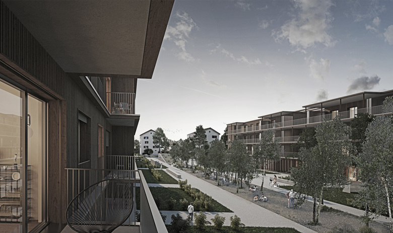 Der südliche Längsbau nimmt sich durch die zurückgesetzte Südfassade gegenüber der Mürtschenstrasse zurück. Private Aussenräume geben dieser Strassenfassade eine Privatheit, welche im Zusammenspiel mit den gegenüberliegenden Bauten (Doppel EFH) den Charakter der Wohnstrasse stärkt. Das vor- und zurückspringende Volumen nimmt dabei die Massstäblichkeit seiner Umgebung auf.