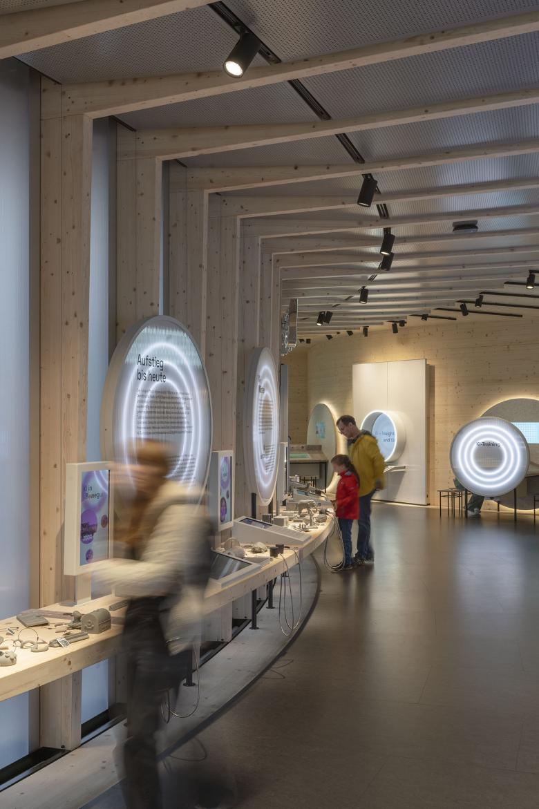On the side opposite the square, the floor plan is defined by four smaller circular segments, which reflect the canopies of surrounding trees. Inside, these form thematic islands with interactive exhibits that delve deeper into various aspects of Artificial Intelligence. Between the islands, the space opens up, creating room for a central exhibit. Extending this area, the walls form a funnel-shaped opening with a panoramic window, offering views of the Neckar canal.