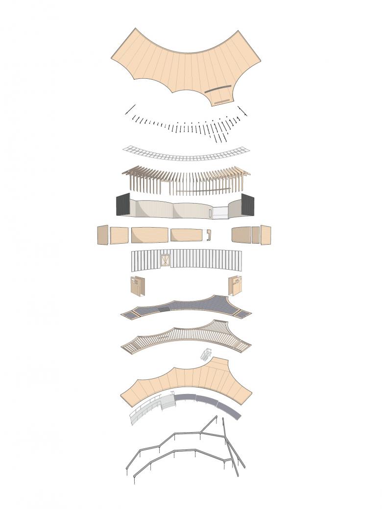 The pavilion, designed for 30 visitors, will initially be placed at the Experimenta square but is also designed to be disassembled and relocated to other sites. At a later date, it could even be moved to the IPAI campus. To facilitate this, a lightweight, modular timber construction is used, prefabricated entirely off-site. The floor plate and roof are made of cross-laminated timber, and the closed wall elements are preassembled with interior walls made from curved CLT, wood fiber insulation, and exterior cladding. The wall facing the Experimenta square is supported by columns, with transparent polycarbonate panels inserted between them. This material not only reduces weight and material consumption but also highlights the pavilion's temporary character while offering excellent light transmission and thermal insulation. The wooden supports and ceiling elements with radially stretching ribs are also prefabricated. The entrance steps, escape staircase, and accessible ramp are designed as additive elements, allowing flexibility for various site conditions.