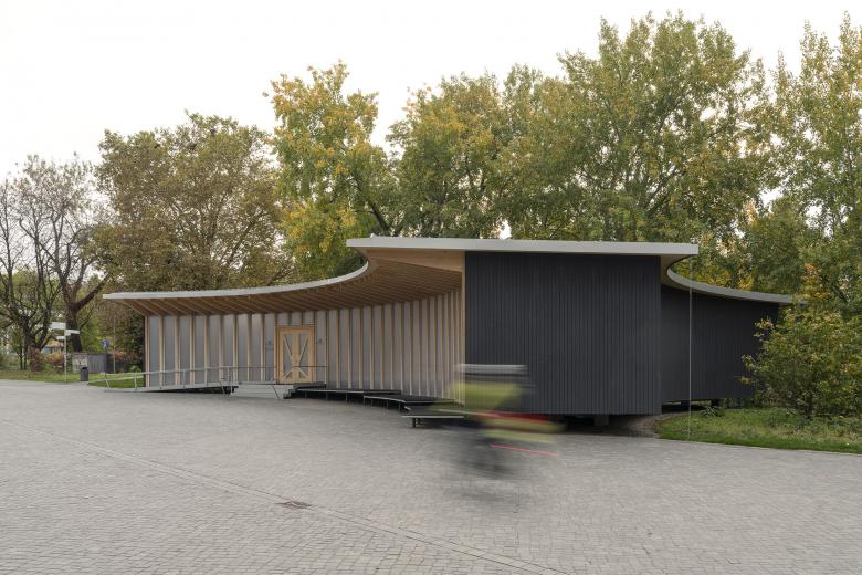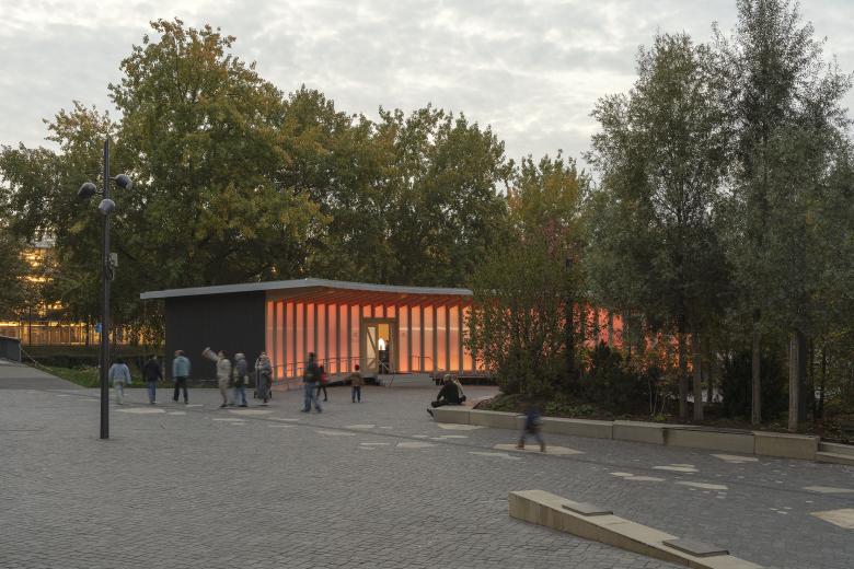 While the Experimenta square was already clearly defined by the two exhibition buildings and the Neckar riverbank, it now finds closure to the west with the pavilion’s curving facade. With its light canopy, the building acts as a modern 'Stoa' on the 'Knowledge Forum.' Stepped platforms provide seating and spaces for discussion, while also leveling the site's slope. The temporary pavilion is thus part of a permanent redesign of the public space concept by UNIOLA and von K landscape architecture, which includes extensive greening of the square: existing tree and seating islands are integrated into a continuous green area, and additional green zones serve as experimental fields for climate-appropriate planting.