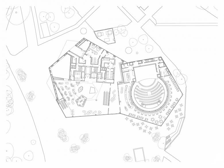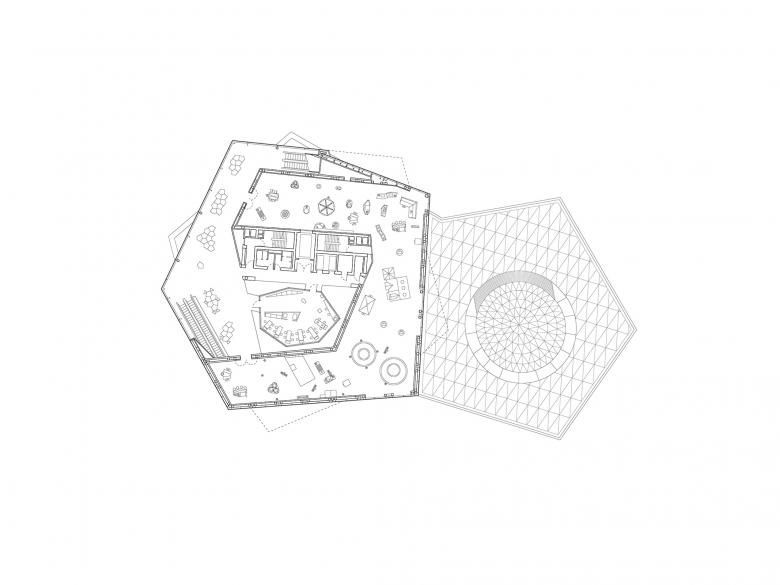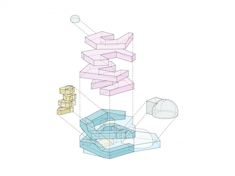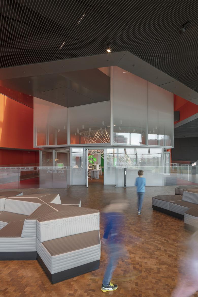 The themed sections on each floor are offset in horseshoe form around the core of the building and a full-height atrium, into which pods are inserted that contain interactive stations. Finally, the helix brings visitors out onto a landscaped roof terrace that offers a panorama of the entire Neckar Valley. Also located on the roof are an astronomical observatory and an auditorium for experimental theatre. An alternative route leads to the basement, where the 360° Science Dome cinema and spaces for temporary exhibitions are located.