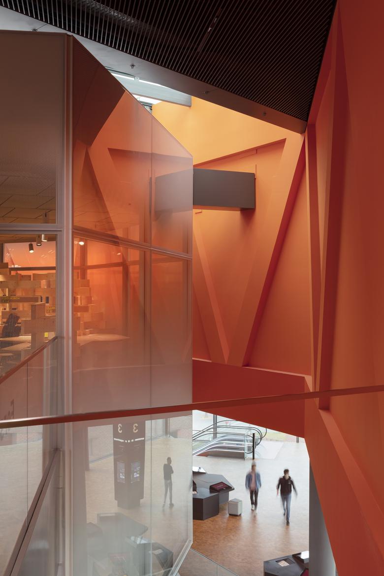 The new building forms an ensemble with a converted warehouse, framing a small piazza from where visitors enter the museum. Passing through the spacious foyer, they move upwards along the helix. This takes them through four levels containing themed exhibition spaces that focus on scientific and technological subjects. For young visitors there are interactive media installations, where they can apply what they have just learned to specific tasks.