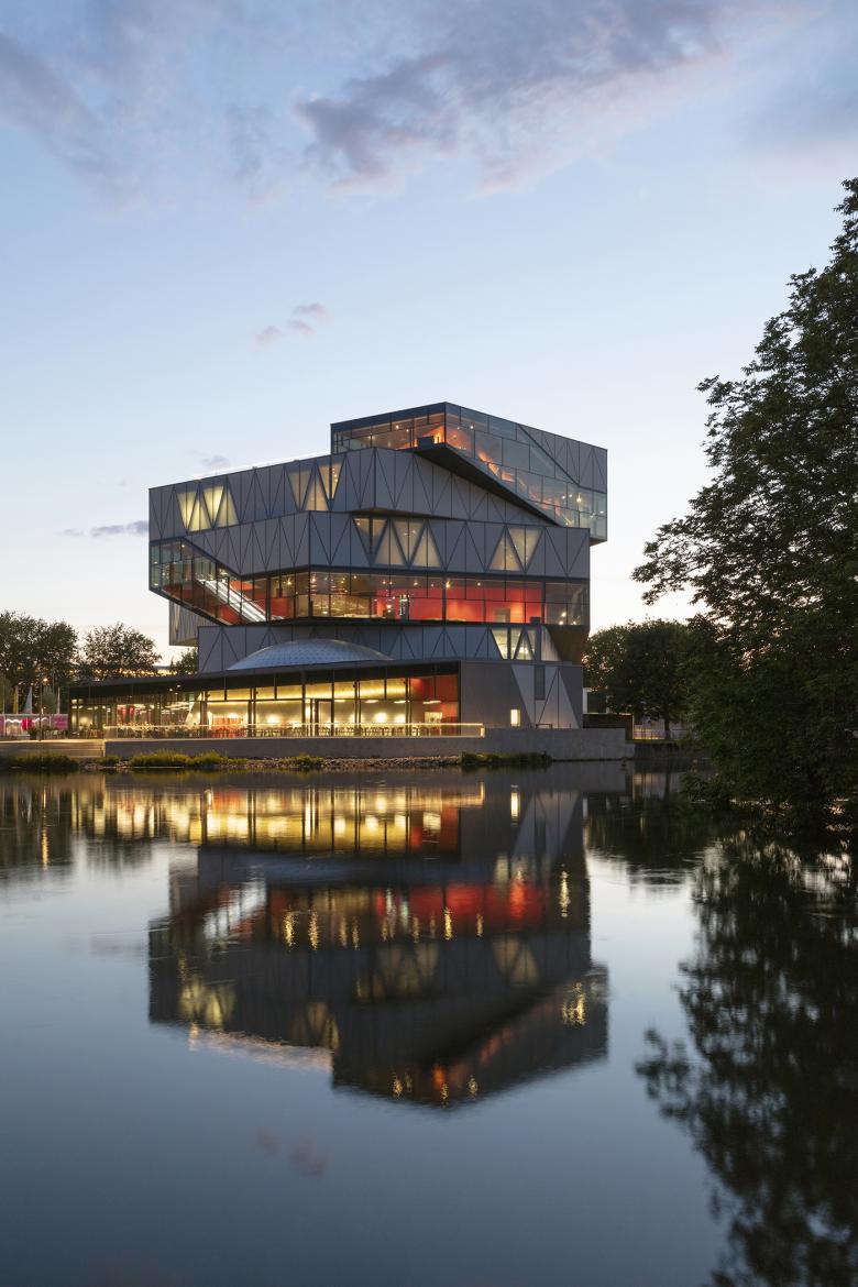This emblematic building stands at the centre of Heilbronn, on an island in the River Neckar. It is conceived as a helical sequence of spaces offering an experience that is finely choreographed between the interior of the building and the surrounding landscape.