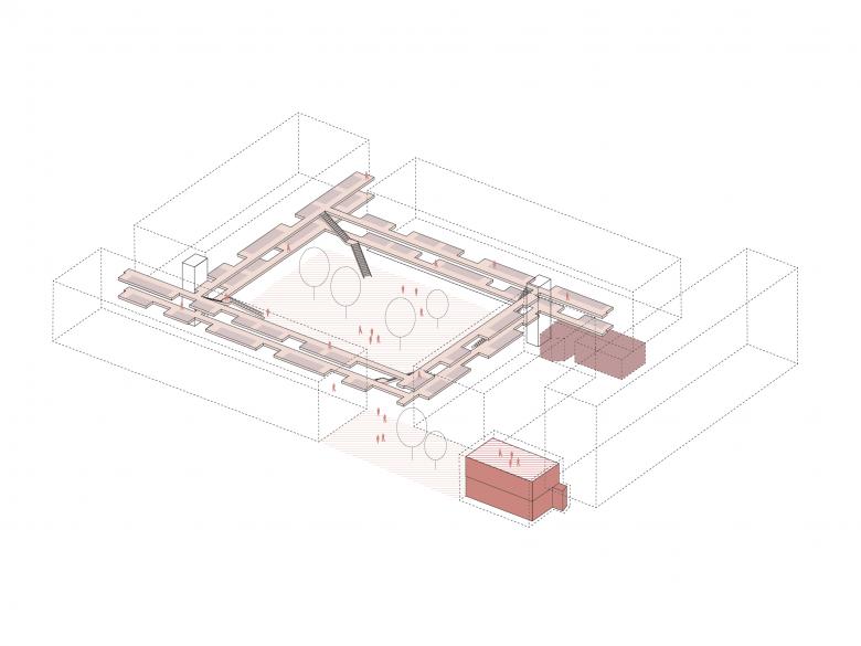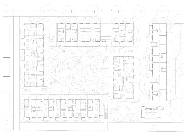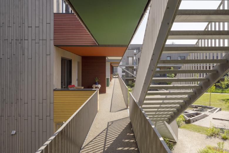 The design embodies the principles of target group diversity and social integration. Four new buildings with a range of residential typologies are grouped around a shared courtyard; from cluster housing to typical family living to small individual apartments. They are connected via column-free walkways suspended and set slightly apart from the façade, which provide wide terraces for the residents to inhabit and experience spontaneous everyday encounters. The colour scheme of the soffits and bulkheads further accentuates these special outdoor ‘rooms’.
