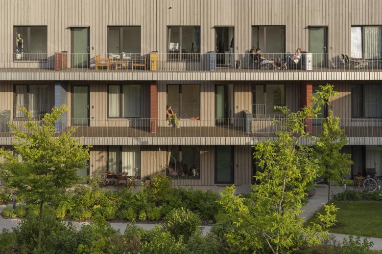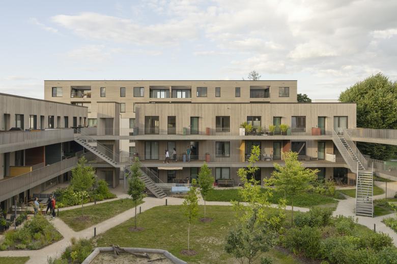 The buildings have a timber frame construction with timber composite floors. Furthermore, an existing building along the north-east edge of the site was renovated and extended by adding two floors in timber construction. The grid of the timber frame allows for a high degree of floor plan variability. Each type of apartment was arranged with two different sizes, so that north-south oriented layouts with reduced depth make better use of daylight. A variety of apartment sizes which correspond to the spatial requirements of different housing and living needs could be implemented in a cost-effective way while offering options for future adaptations.