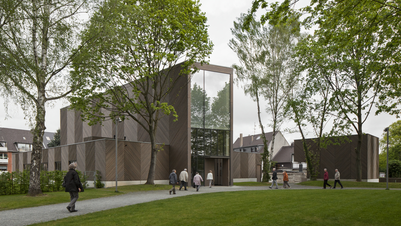 The ensemble of buildings designed for the Protestant Brückenschlag parish in Cologne comprises a small chapel for private prayer, a bell tower and the church itself. These are grouped around a raised lawn that is defined by a ring of mature trees. This contemplative entrance situation also provides an ideal setting for the congregation’s outdoor activities. It is reached from the street up a shallow flight of steps marked by a prominent bell tower.