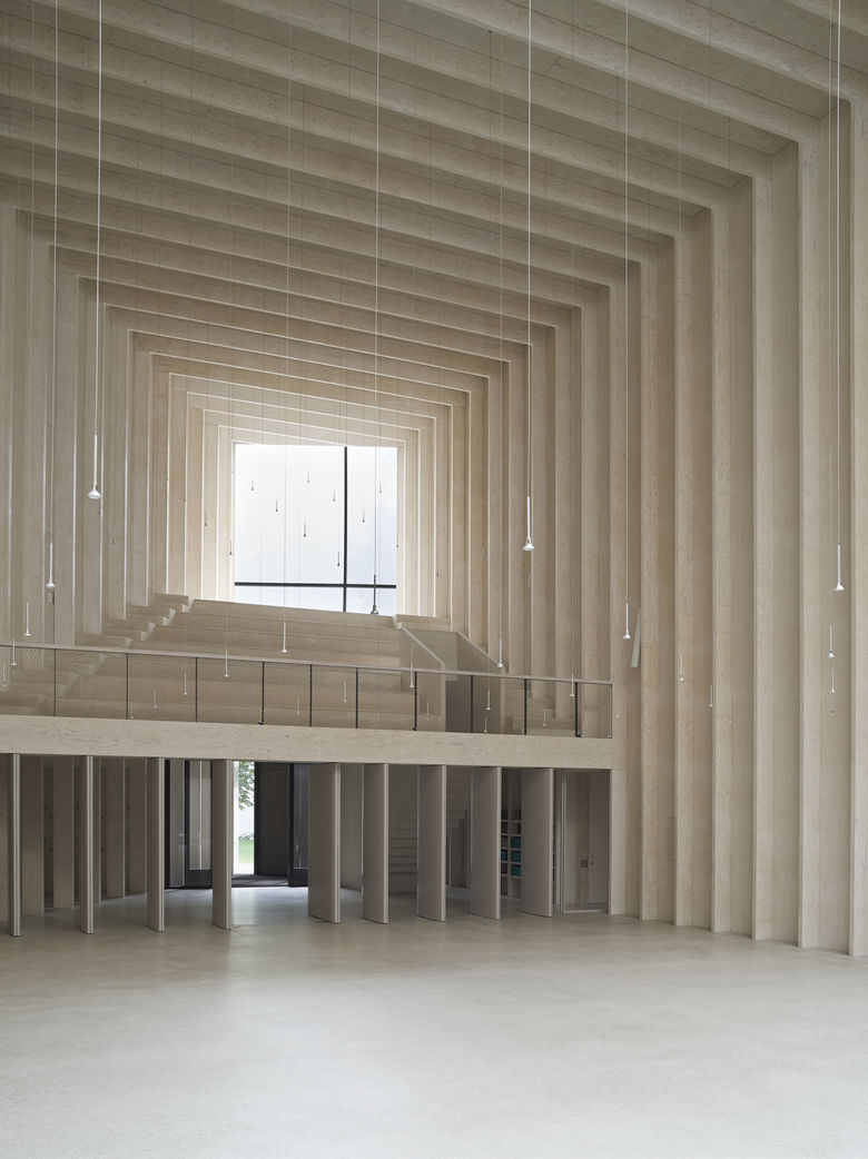 All three of the ensemble’s buildings are clad externally with diagonally laid timber planks, while inside, the load-bearing structure of prefabricated timber columns and panels is left unclad. The church’s evocative character owes much to its treatment of natural light, which enlivens the altar screen and the matt glass panel above the gallery opposite, where the changing shadows from the trees form a natural complement to the play of colours on the screen.