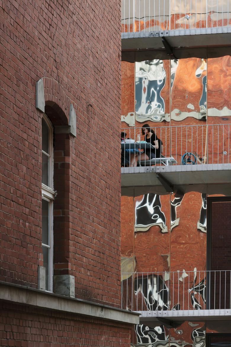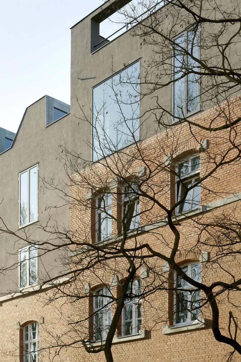 For the time being, the most recent addition to the ensemble was Haus 6, completed in 2017. This residential and studio building occupies the plot between a historic brick building and a contemporary structure in exposed concrete designed by the architects Augustin and Frank, housing studios for the artist Katharina Grosse. The building’s height and roof profile mediate between its two neighbours. The façade’s slightly undulating stainless steel cladding irregularly reflects the surroundings, lending the building a quasi-fluid character.