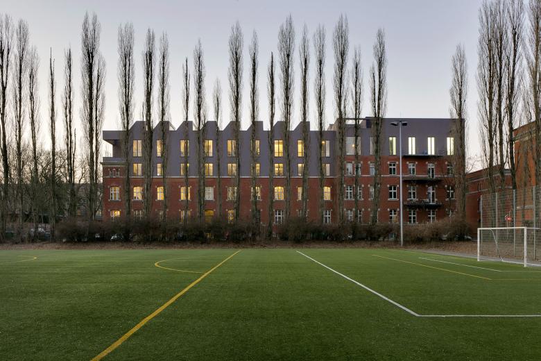 At the entrance to the site, a new building with apartments and offices was erected in 2015. The exterior massing of Haus 9 is a response to the planning regulations that govern the development of the plot. The building adopted the high ceilings and generous windows from its historic neighbours, as well as the simple, repetitive structure with which they have accommodated a wide variety of uses. Its interior layout, however, changes from floor to floor depending on the kind of living and working spaces preferred by individual members of the cohousing group.