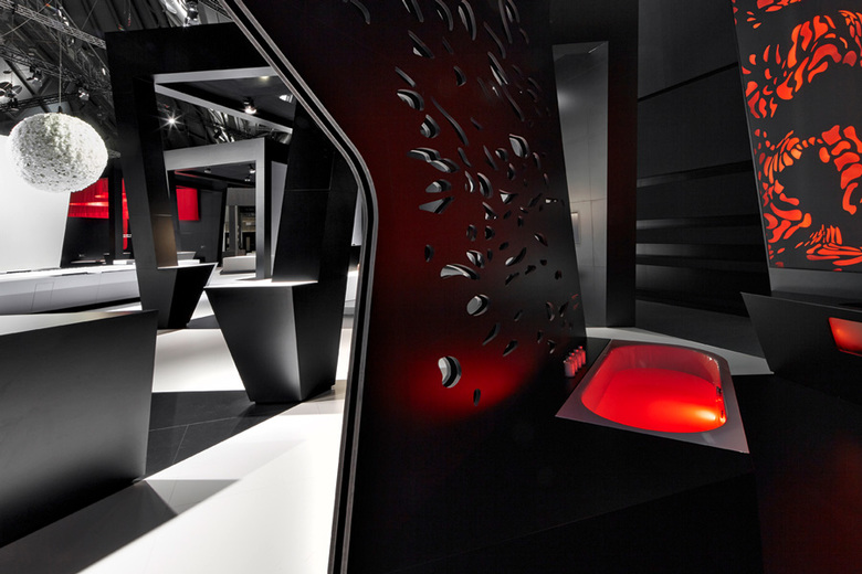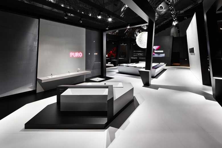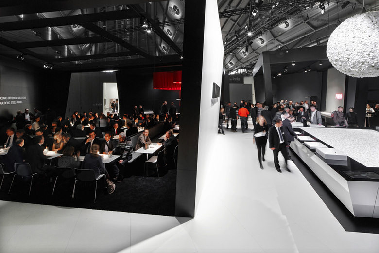 The design of the stand is inspired by a network of intersecting beams of light, to mirror the brand’s dazzling design quality. These beams divide the space into prisms – the lines are not parallel, but converge on three distant vanishing points. It’s a three-dimensional matrix that creates a central court with walls that lean in towards the center – a dynamic interplay of perspective and proportion creating a dramatic stage for the center point of the installation. The iconic design of the display rooms draws the viewer’s attention to the material, color and harmonic design of the products. Music, scent and a different lighting concept in each room create an experience for all the five senses, making the fascination of the Kaldewei brand tangible.