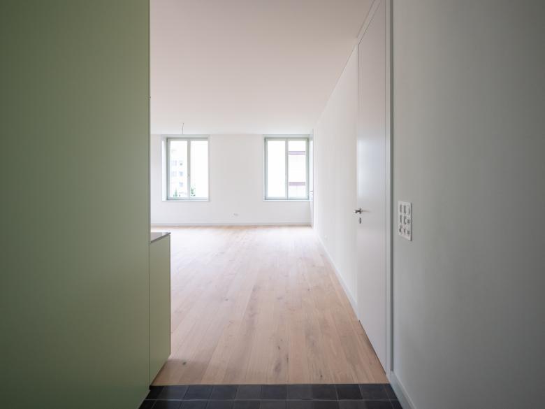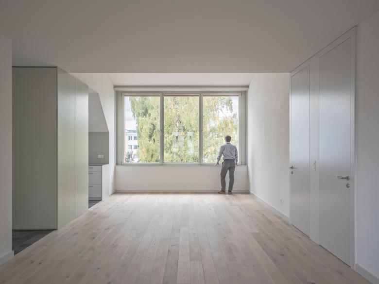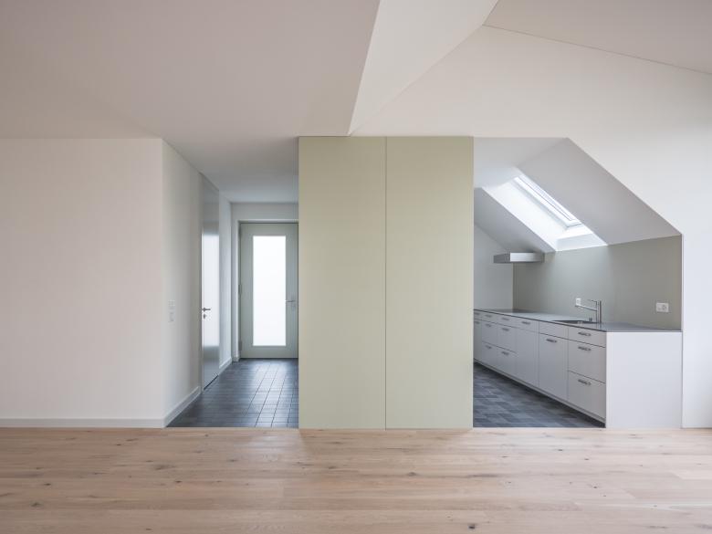 Die Hauptausrichtung der drei ursprünglichen Wohnungen und die representative Klinkerfassade waren gegen Norden auf die ehemals bedeutungsvolle Grenzstrasse zu Konstanz ausgerichtet. Durch das Herauslösen des Treppenhauses aus dem Bestandes-volumen in Kombination mit der neuen Balkonschicht, konnten drei einfach konzipierte und grosszügige Stadtwohnungen entworfen werden. Die Hauptausrichtung der Wohnungen orientiert sich neu gegen Süden zum vorgelagerten gemeinsamen Garten.