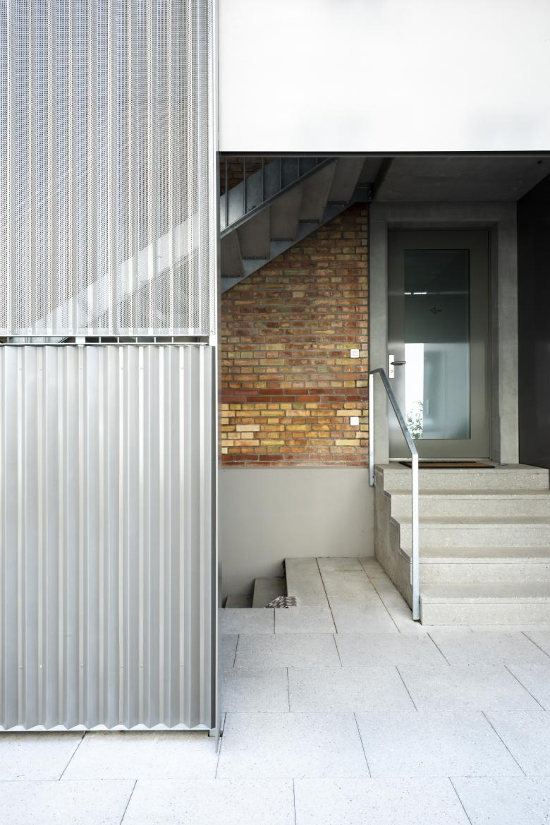 Das neu angefügte Erschliessungsvolumen manifestiert sich in seiner technoiden Ausformung als eigenständiges Element. Die direkte Materialisierung in Beton und Metall ist eine Reminiszenz an die Klinkerarchitektur und der damit zusammenhängenden Historie der Industrialisierung in Kreuzlingen. Horizontale Gliede-rungen des Falzbleches übernehmen die Ornamentik der Backsteinarchitektur.