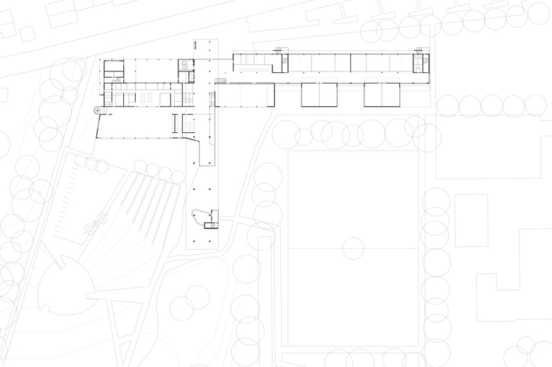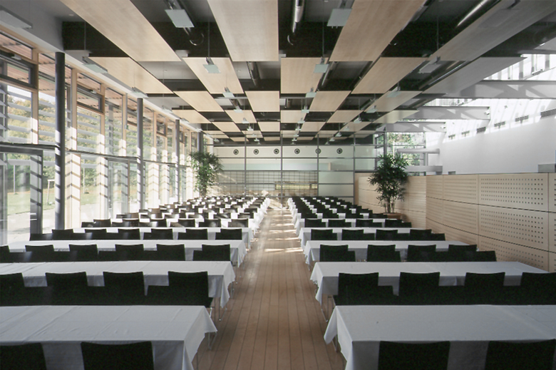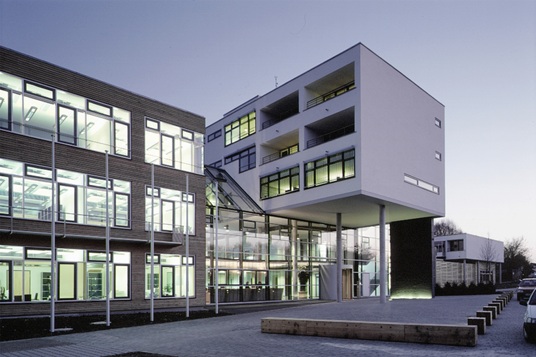 Die Gebäudekonfiguration antwortet auf den winkelförmigen Grundstückszuschnitt. Auch bei einer möglichen Erweiterung bleibt der Landschaftsverbrauch gering und der Zusammenhang der Freiflächen gewahrt. Die topographische Besonderheit - das Faiminger Tälchen - bleibt als großzügiger Grünraum erhalten. Die Aufständerung des Wohnflügels unterstützt dieses Freiraumkonzept. Die klare Baukörperausformung entspricht der inneren Organisation. Durch eine eindeutige Zonierung ist eine gute Orientierung gewährleistet. Die kompakte Bauweise mit bis zu sechs Geschossen minimiert die versiegelte Fläche und ermöglicht eine wirtschaftliche Realisierung. Im nordöstlichen Grundstücksteil wird der dreigeschossige Schulungstrakt mit Innenhöfen und Verwaltung angeordnet. Eine großzügige, über dreigeschossige Lufträume verknüpfte Erschließungszone dient dem kommunikativen Austausch.