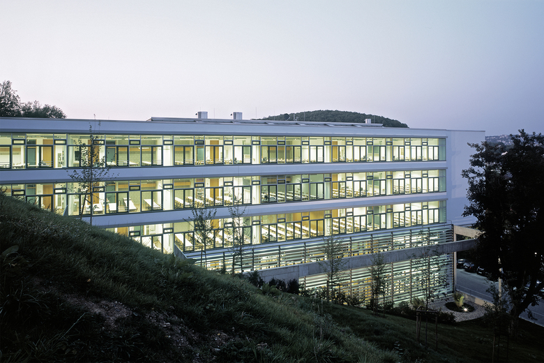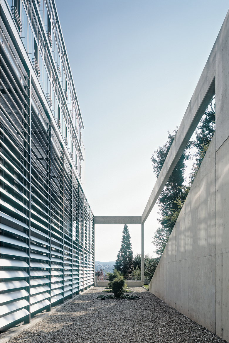 Das bestehende „Schulzentrum am Hang“ wird am südlichen Gebäudeende ergänzt durch den quer zum Hang ausgerichteten Erweiterungsbau unter Beibehaltung der bestehenden Gebäudehöhen. Die kompakte Lösung trägt den ökologischen und ökonomischen Gesichtspunkten Rechnung, wobei eine Differenzierung im Inneren und im Äußeren die Identifikation der Schüler fördern soll. Die Baukörper sind nutzungstechnisch eindeutig ablesbar. So zeichnen sich im zweigeschossigen Sockel die Fachräume ab, die zum baulich gefassten Patio orientiert sind. Darüber legt sich ein dreigeschossiger nach Süden orientierter Klassentrakt, der nach Osten auskragt. Verbunden werden die beiden Baukörper durch das fünfgeschossige nördliche Erschließungsbauteil, das gleichzeitig als Bindeglied zum Bestand genutzt wird. Dieser Bauteilausbildung entsprechend kommen zwei architektonische Prinzipien zur Anwendung. Zum einen die Verzahnung von Sockel und Patio mit dem Naturraum und zum anderen das „Loslösen“ des Klassentraktes von der Natur, um diese zu inszenieren. In den beiden Sockelgeschoßen ist eine behindertengerechte Verknüpfung mit dem zentralen Foyer gegeben, die sich im 1.Obergeschoss mit den Verkehrsflächen des Bestandsbauteil B zu einer Runderschließung ergänzt. Durch die Übernahme der Gebäude- und Geschoßhöhe von Bauteil B können mit dem Aufzug alle Ebenen, sowie das Vorplatzniveau behindertengerecht erreicht werden. Durch das Querstellen des Erweiterungsbaus zum Hang entstehen zwei neue Außenräume mit unterschiedlichen Qualitäten. Zum einen entsteht im Norden ein Hof zwischen dem Erweiterungsbau und dem Bestand, der als Pausenfläche genutzt wird und durch Sitzstufen sowie einer Baumbepflanzung aufgewertet wird. Zum anderen entsteht im Süden ein Patio mit kontemplativer Atmosphäre, der den Ausblick in den Wald wie auch auf die Villa Klingspor inszeniert.