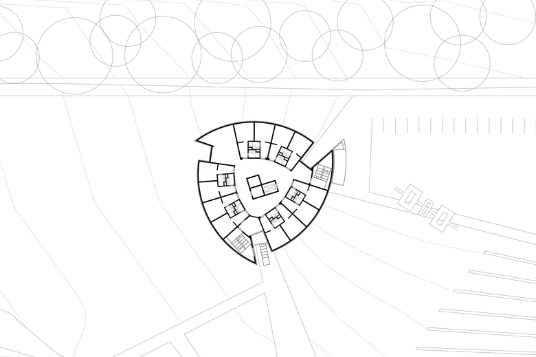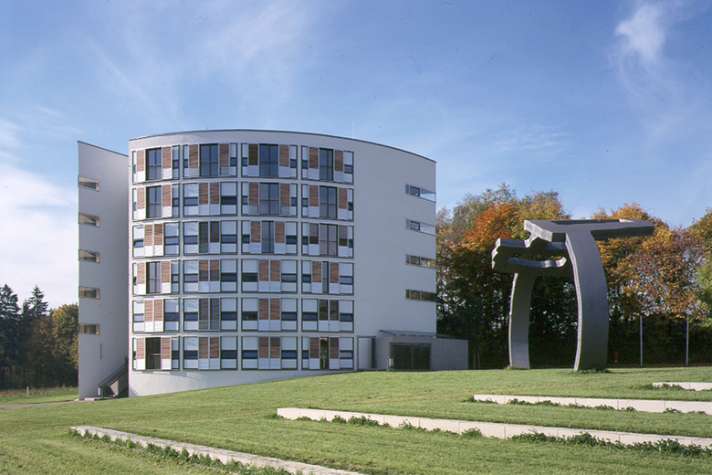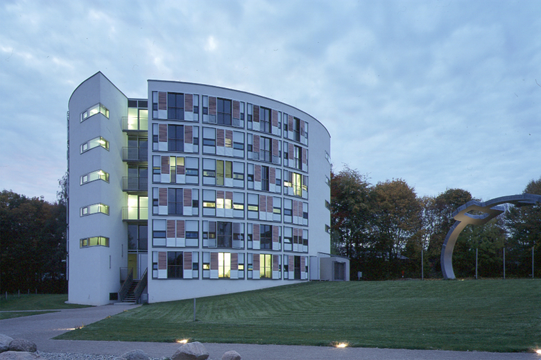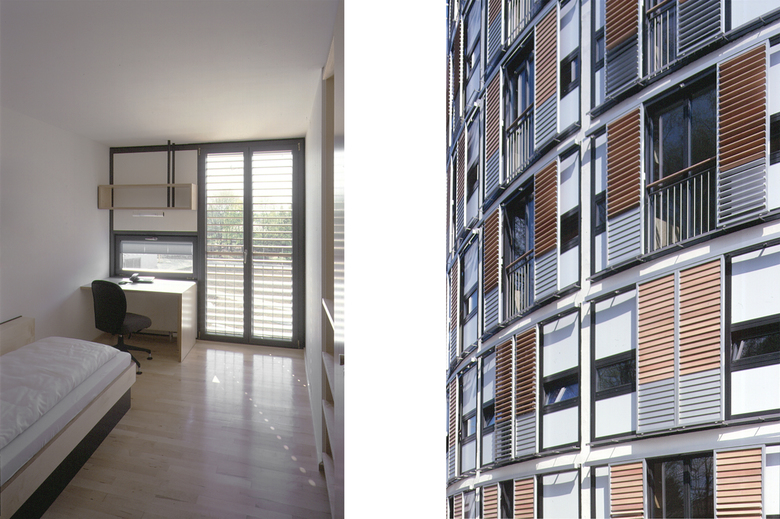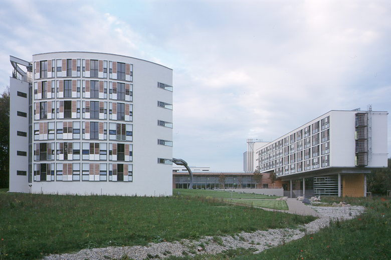 as Internat liegt als 6-geschossiger Solitär im sich nach Süden öffnenden Grünraum. Die großzügige Teichanlage mit Überlauf und anschließenden Sukzessionsflächen definiert das Ende des Faiminger Tälchens. Steganlagen und terrassierte Sitzstufen schaffen besondere Aufenthaltsqualitäten am Wasser. Bei der Baukörperausbildung und -gestaltung kommen zwei gegensätzliche Prinzipien zum Tragen. Zum einen gibt es die „bodenständigen Bauteile, die mit der Natur verzahnen, zum anderen die scheinbar schwebenden, losgelösten. Dieses dialektische Prinzip wurde in Fassadenoberflächen umgesetzt. Die natürliche Holzbekleidung (Lärche) bildet einen Kontrast zu den weißen Putzoberflächen der aufgeständerten Bauteile. Die unterschiedlichen Nutzungsbereiche sind dabei durch ihre je eigenständige Form ablesbar.